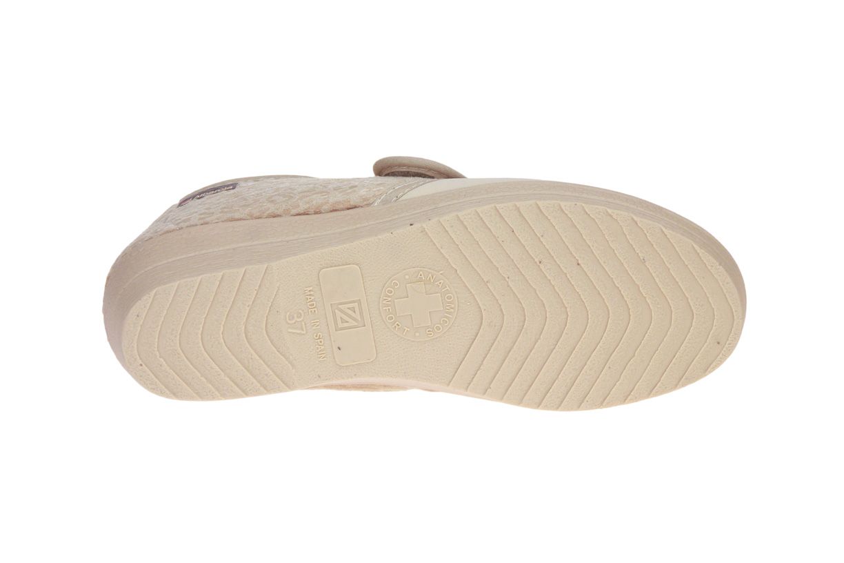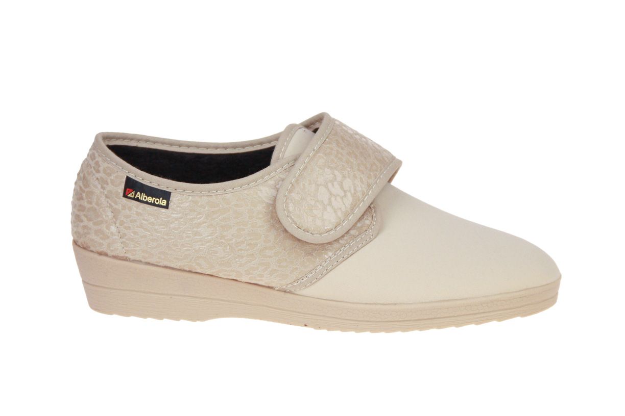 Beige textielen damespantoffel met velcrosluiting van het merk Alberola.