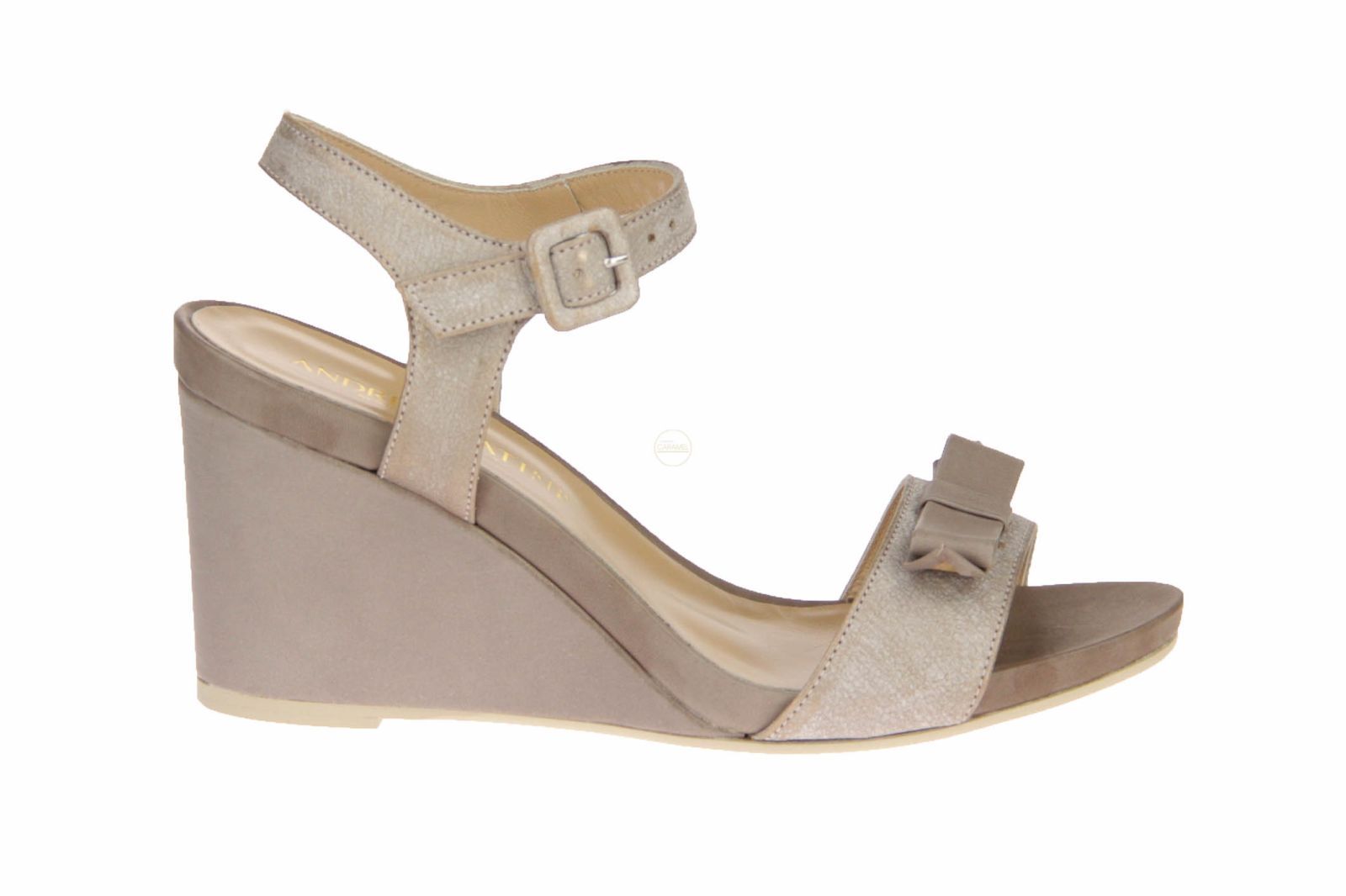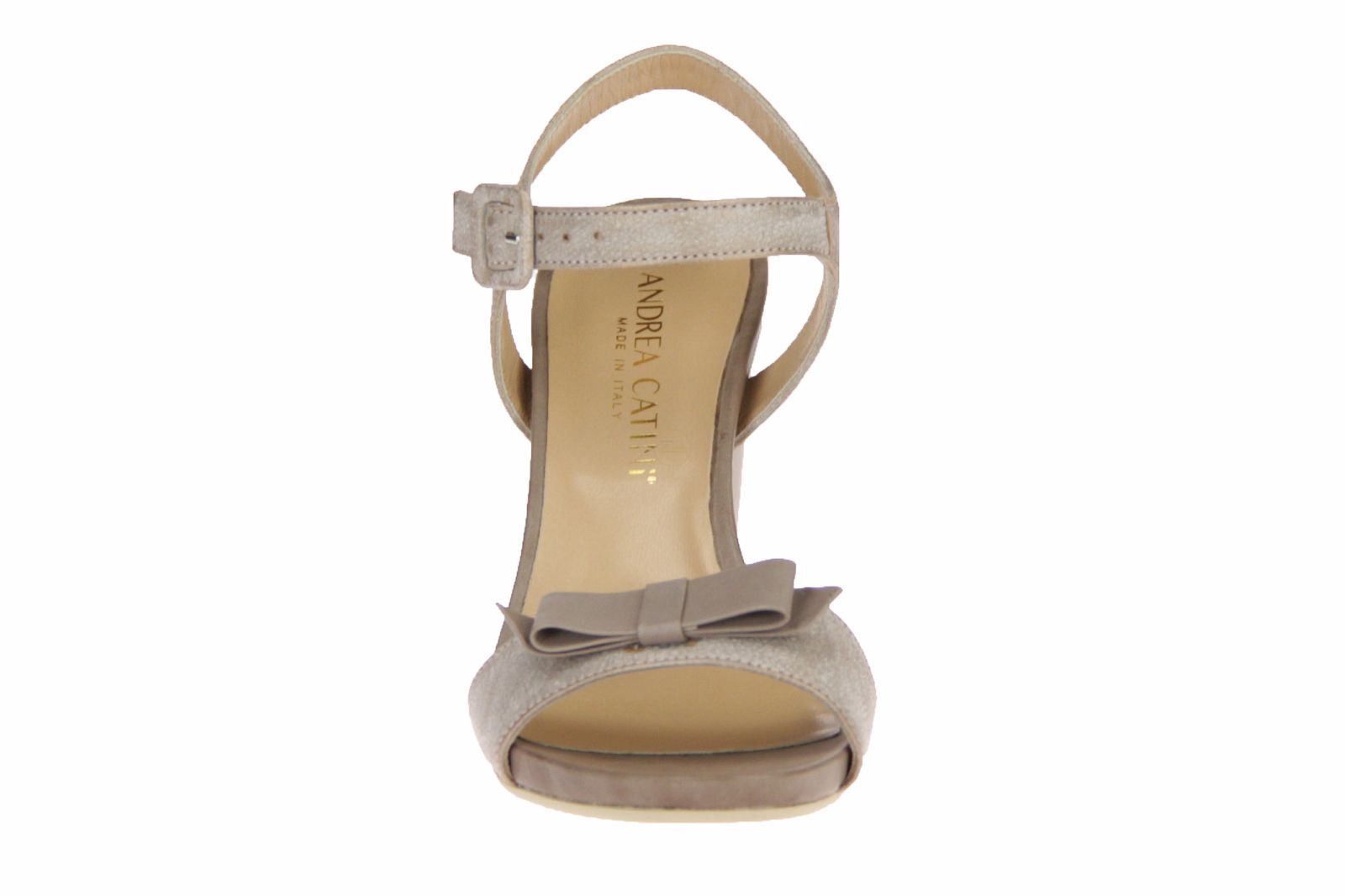 Deze taupe sandaal van het merk Andrea Catini is overtrokken met metallic. Het bandje over de voet is fijn afgewerkt met een strikje.