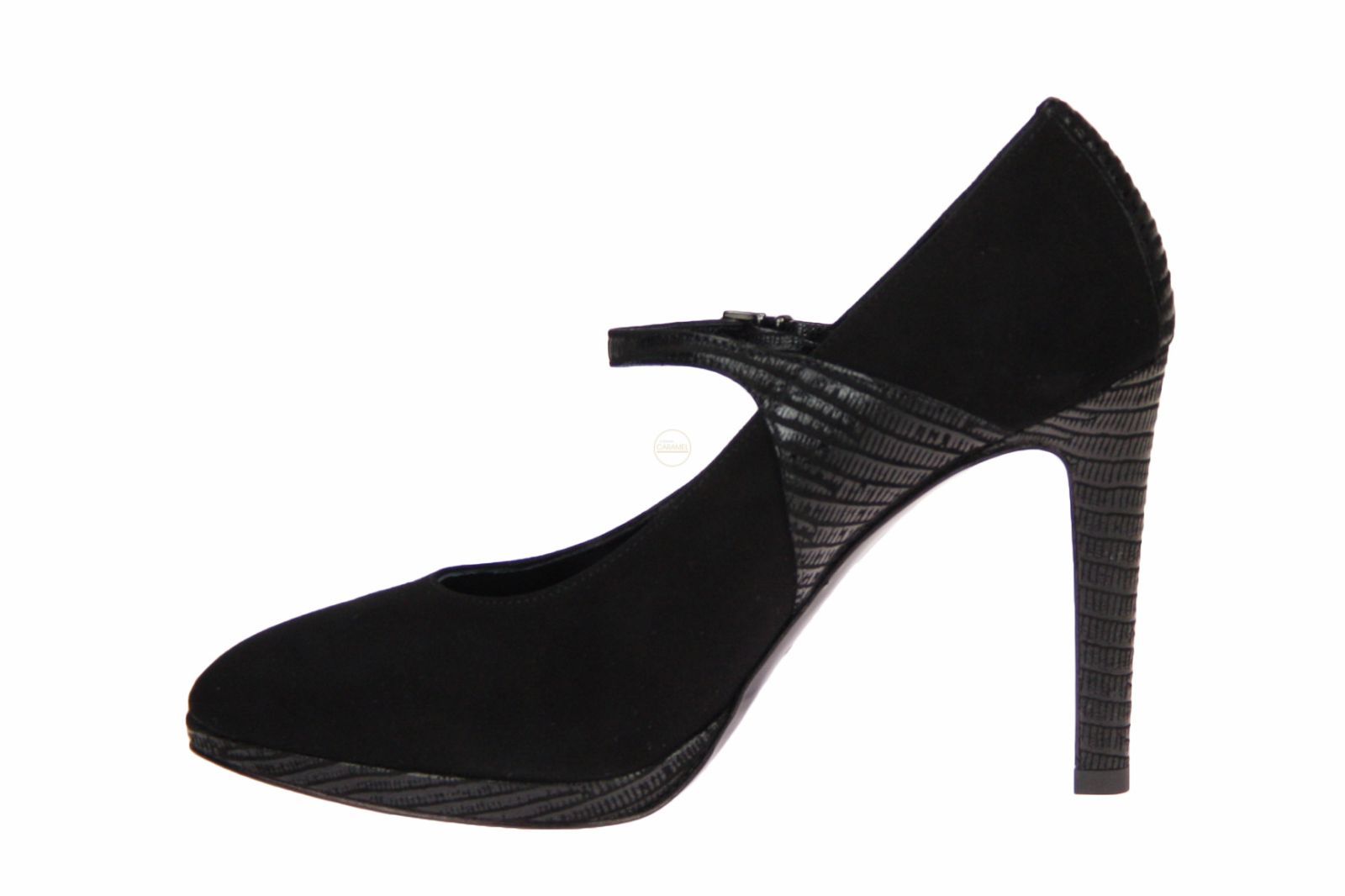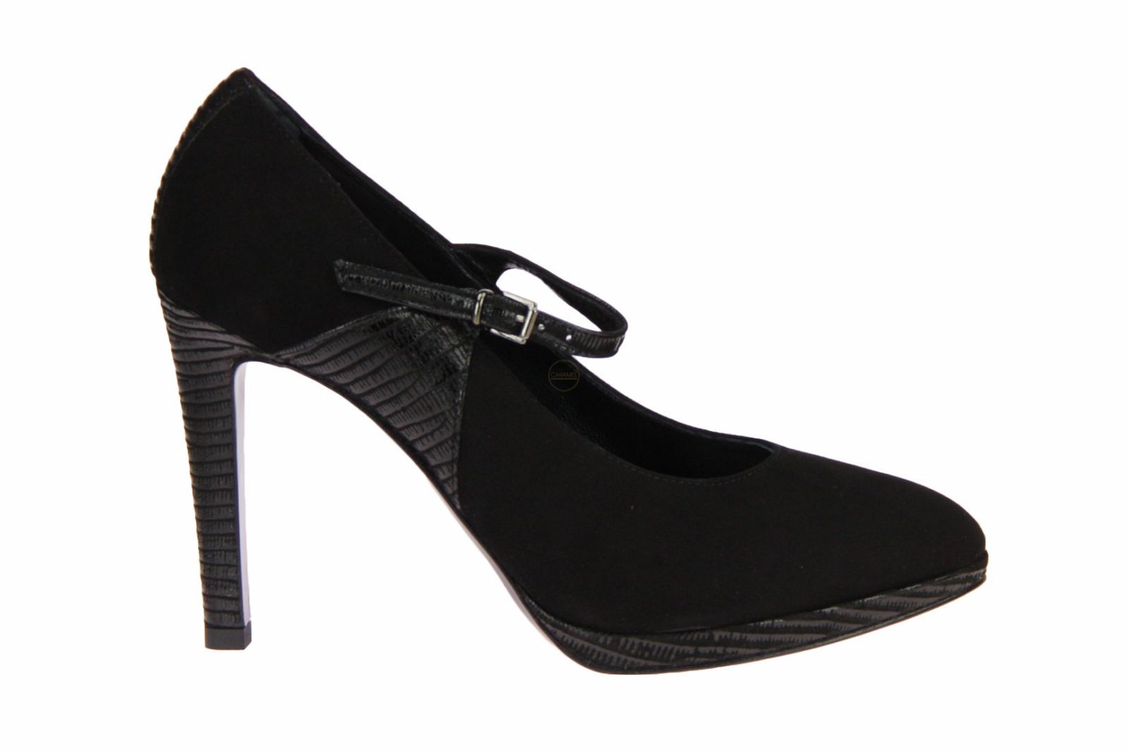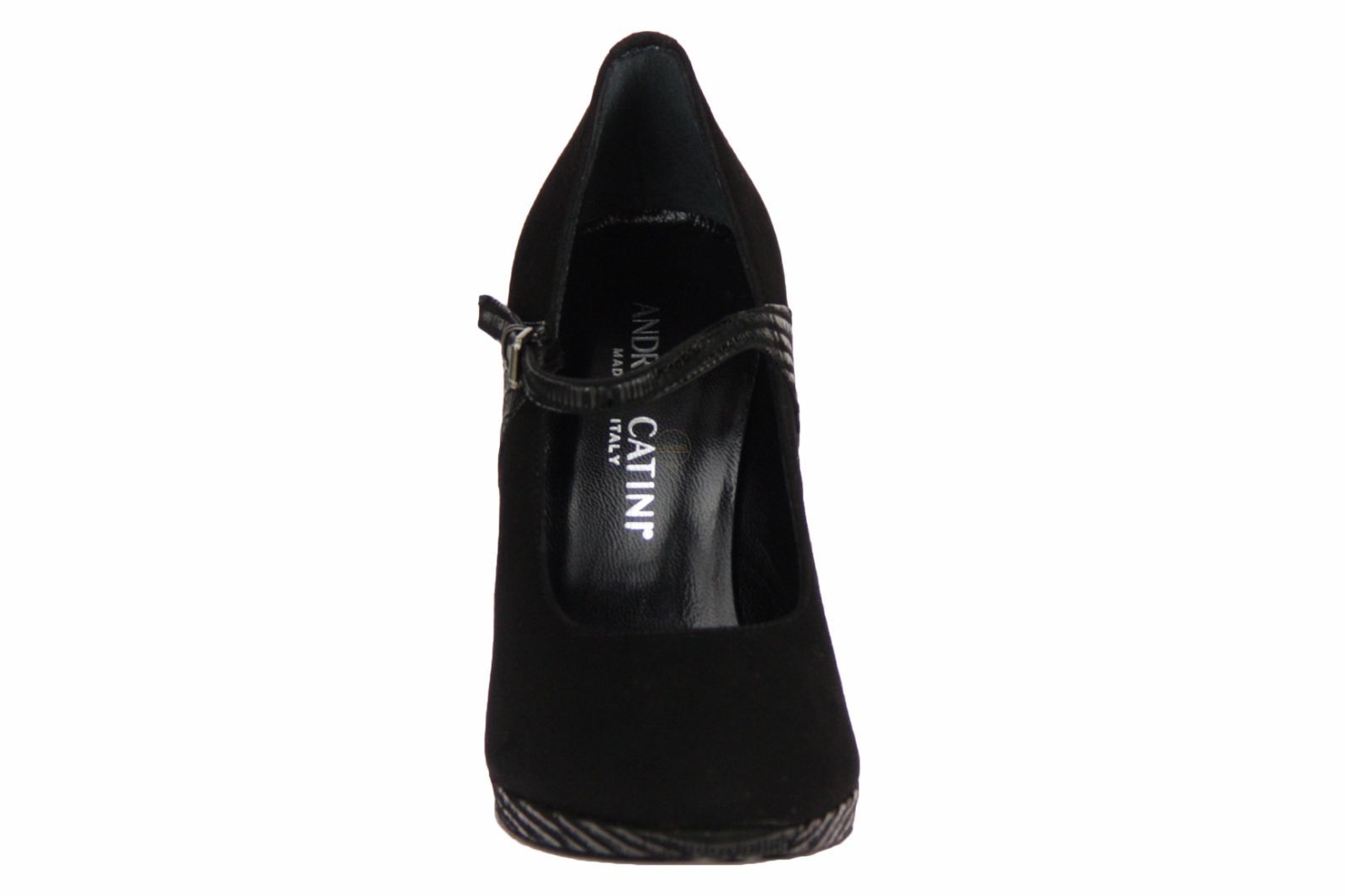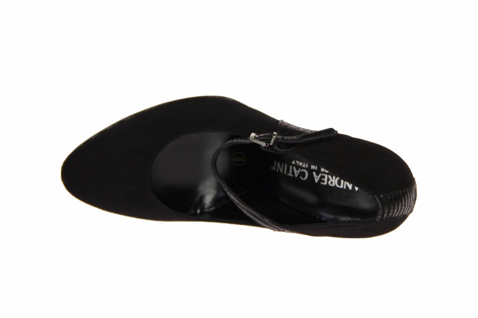 Zwart suede pump van het Italiaanse merk Andrea Catini. De pump is afgewerkt met een gespje over de wreef.