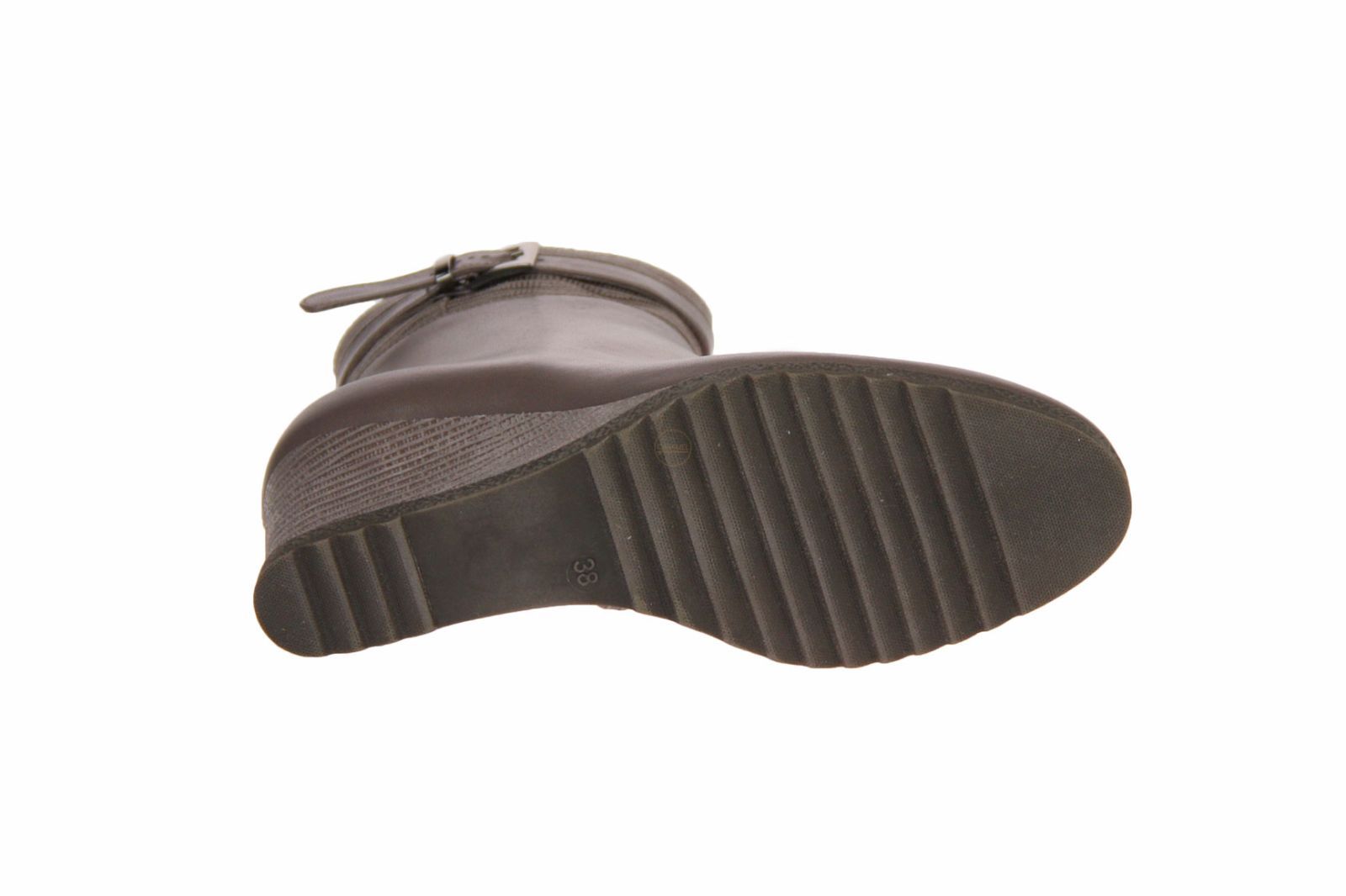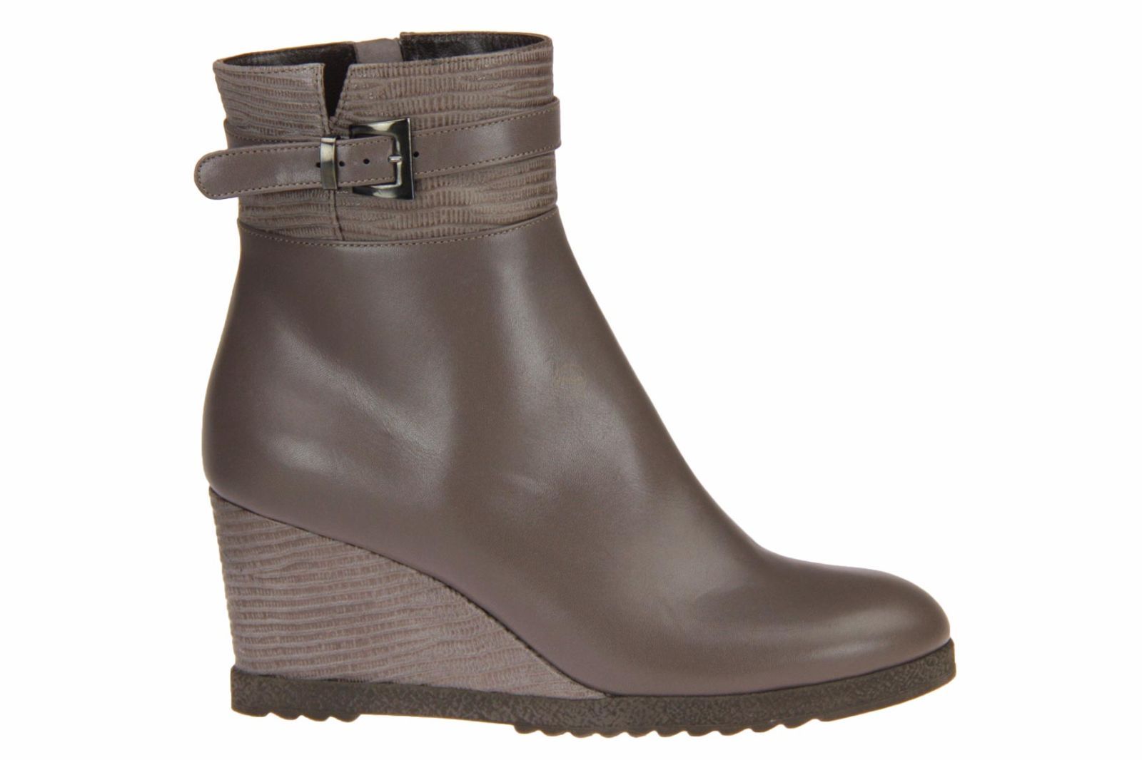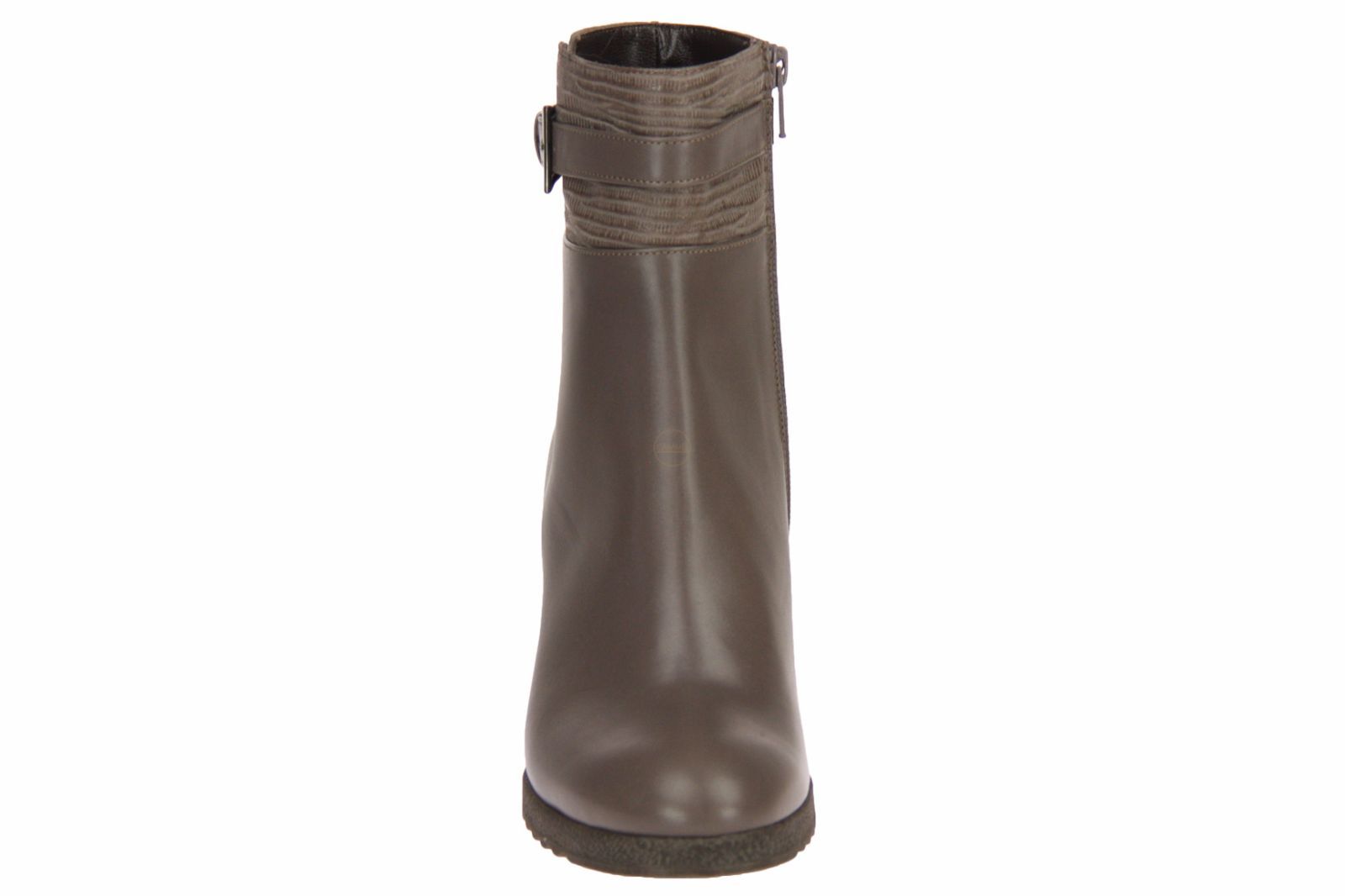 Taupe kort lederen dameslaarsje van het Italiaanse merk Andrea Catini. De sleehak van de laars is afgewerkt in het suede.