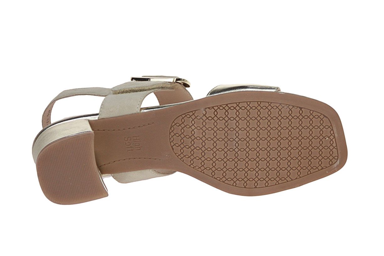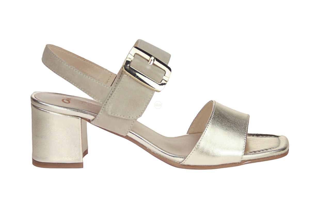 Deze beige suède damessandaal met gouden accenten is van het merk Ara.