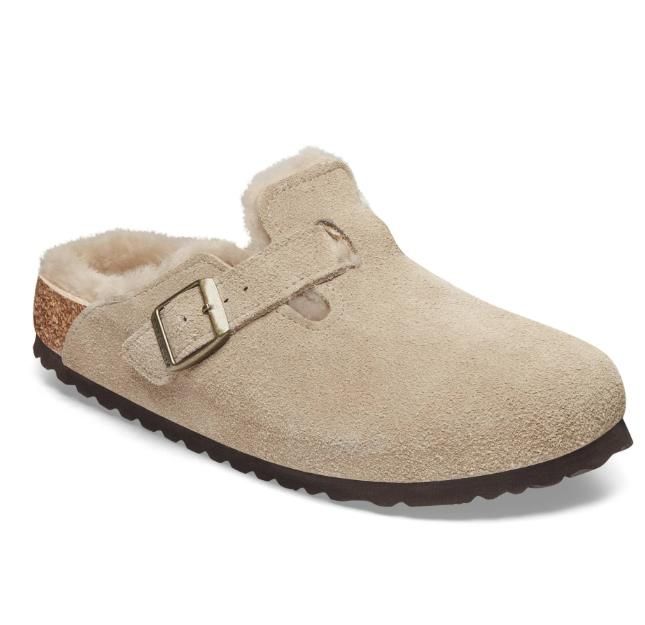 Taupe suède damesslipper van het merk Birkenstock. Dit model heeft een binnenvoering van pels.