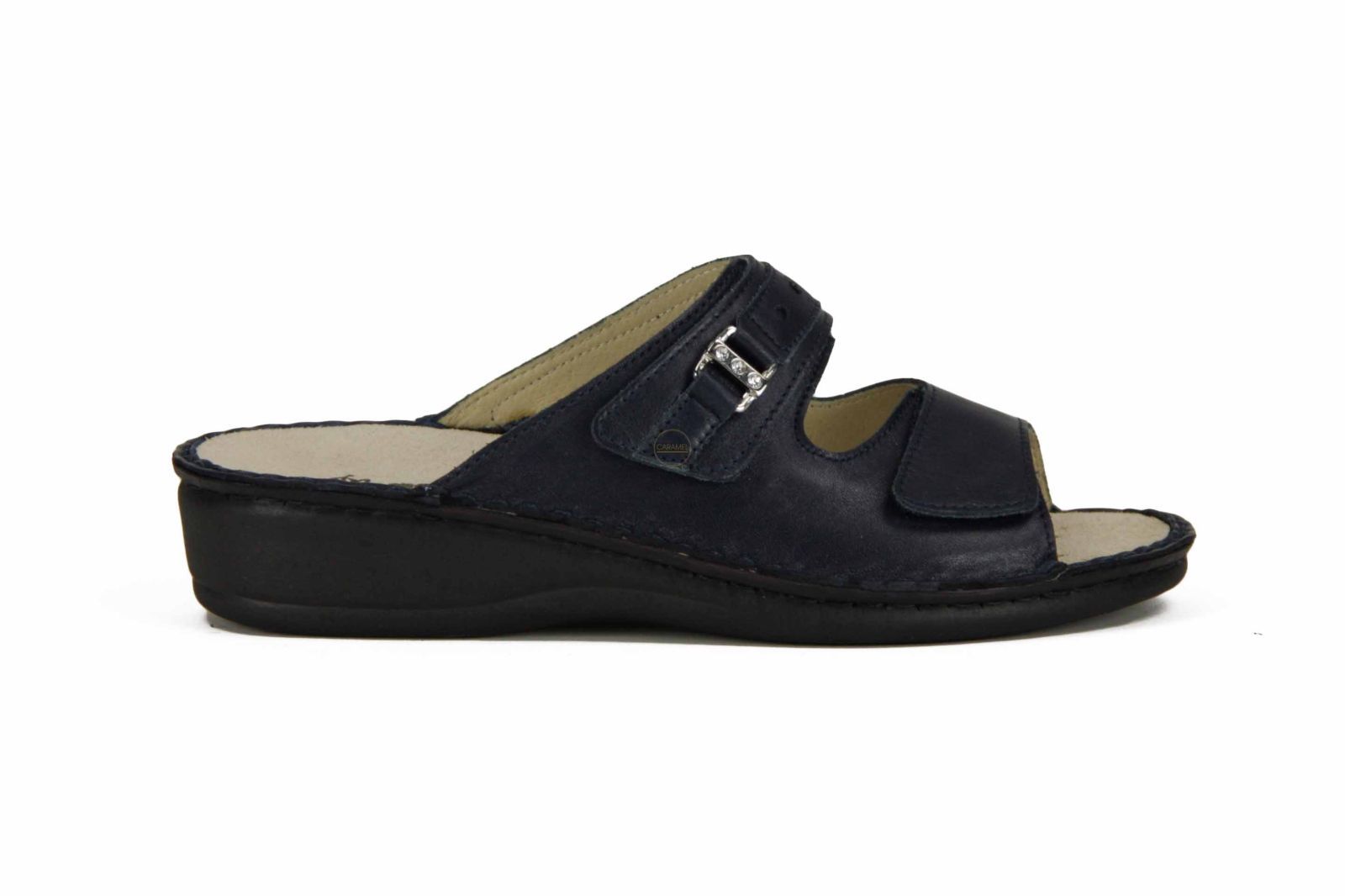 De pantoffel voor mensen met steunzolen, de zool is uitneembaar. Hij past perfect rond de voet dankzij de dubbele verstelbare velcro sluiting. Een fijn detail in een kleine siergespje met strasssteentjes.