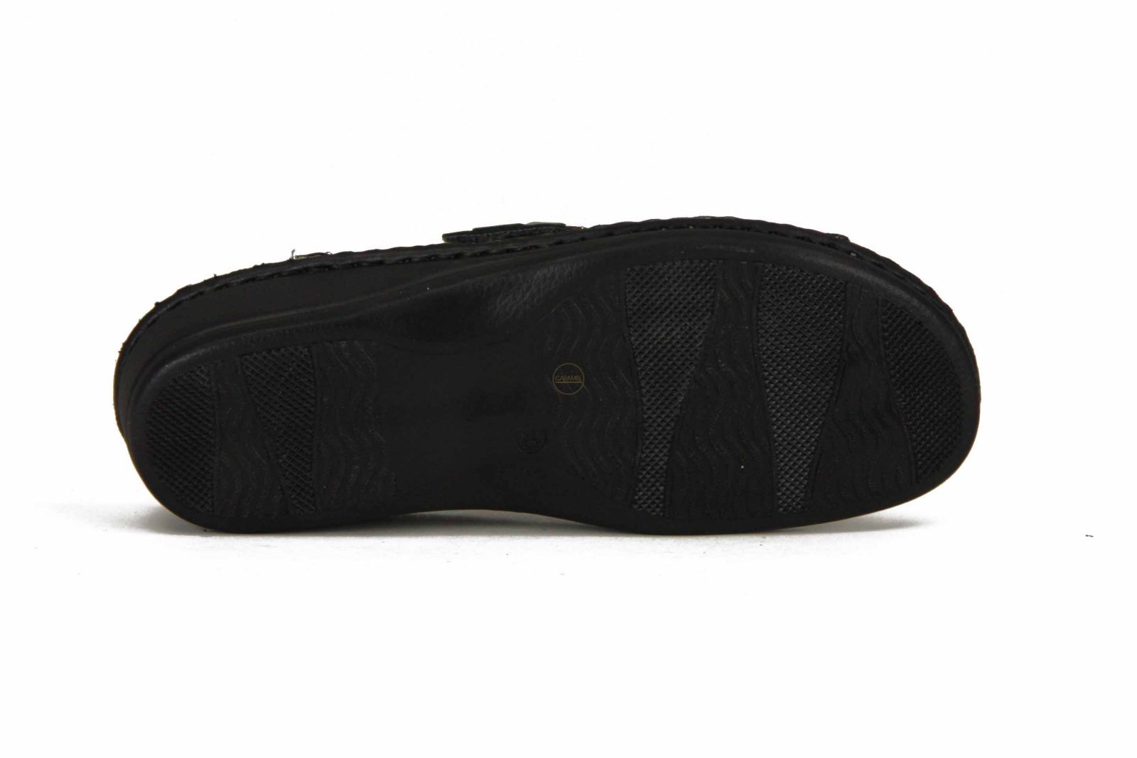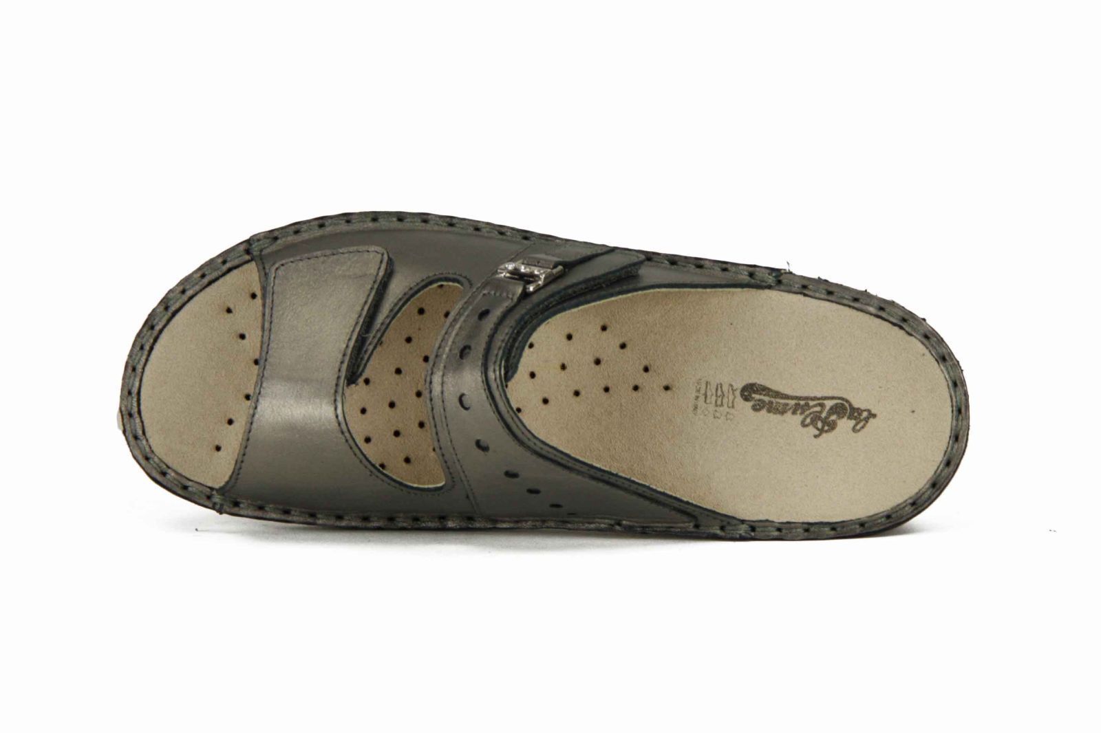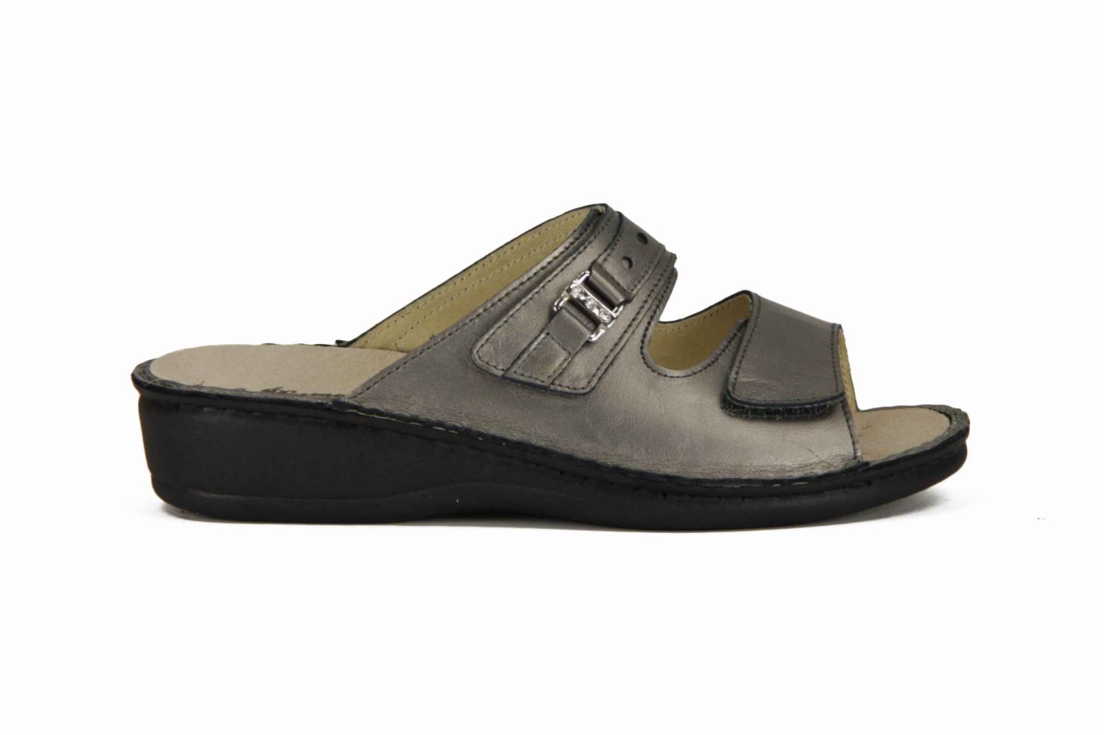 De pantoffel voor mensen met steunzolen, de zool is uitneembaar.Hij past perfect rond de voet dankzij de dubbele verstelbare velcro sluiting. Een fijn detail in een kleine siergespje met strasssteentjes.