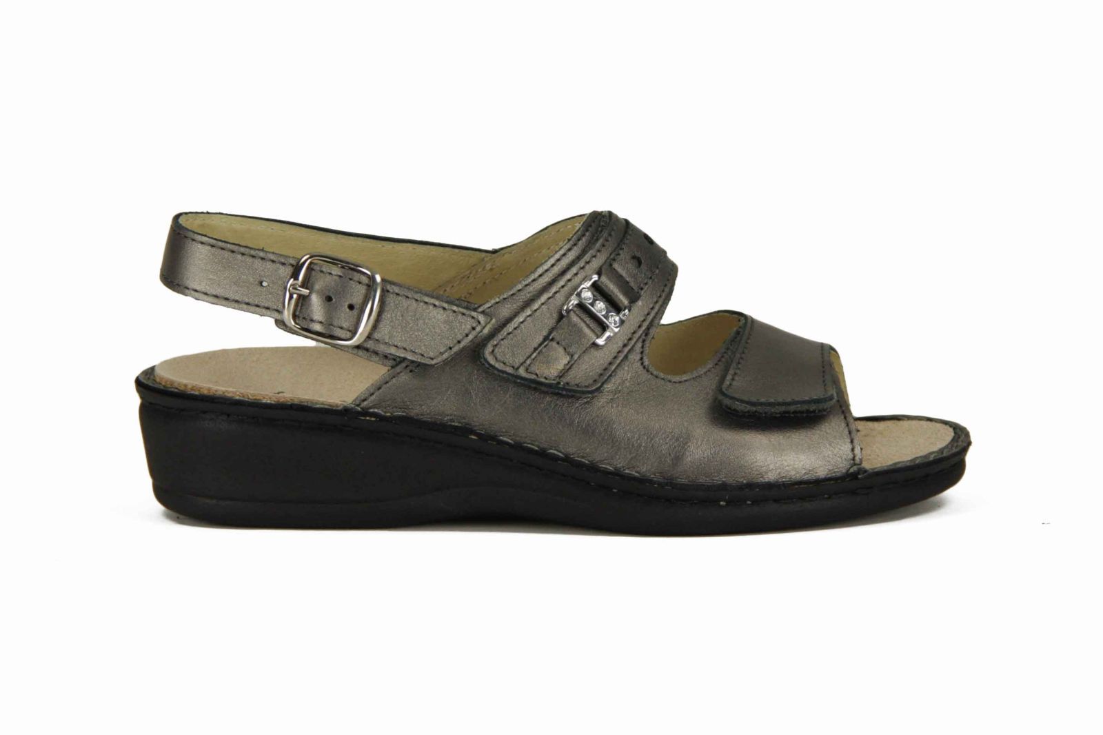 De pantoffel voor mensen met steunzolen, de zool is uitneembaar. Hij blijft perfect zitten rond de voet dankzij de dubbele velcro sluiting en het vertstelbare riempje achteraan. Een fijn detail in een kleine siergespje met strasssteentjes.