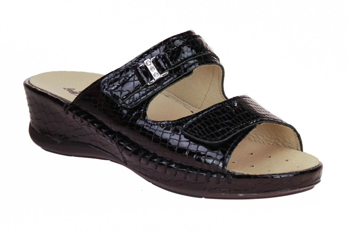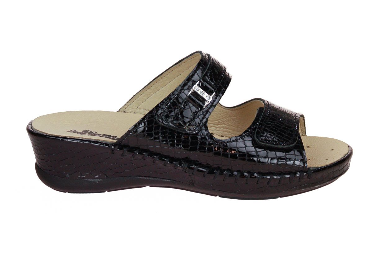 Deze zwart laklederen damesslipper is van het merk La Plume. De binnenzool is uitneembaar, ideaal voor steunzolen.