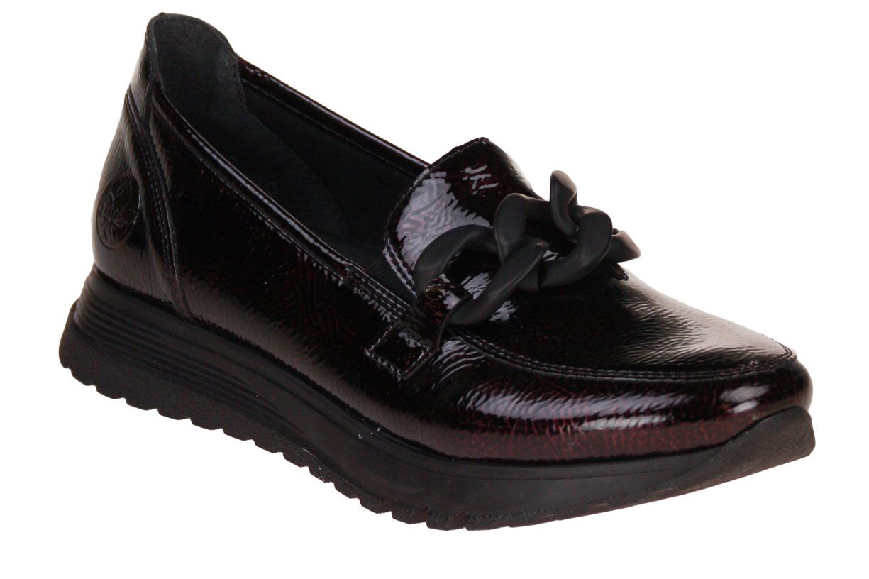 Deze laklederen damesschoen is van het merk Rieker. De binnenzool is uitneembaar, ideaal voor steunzolen.