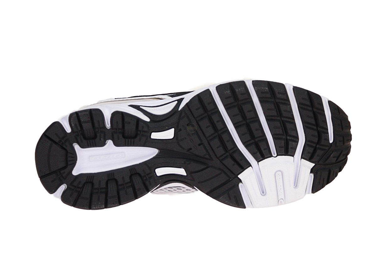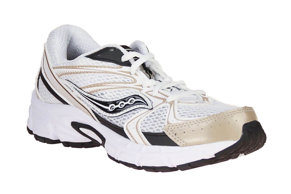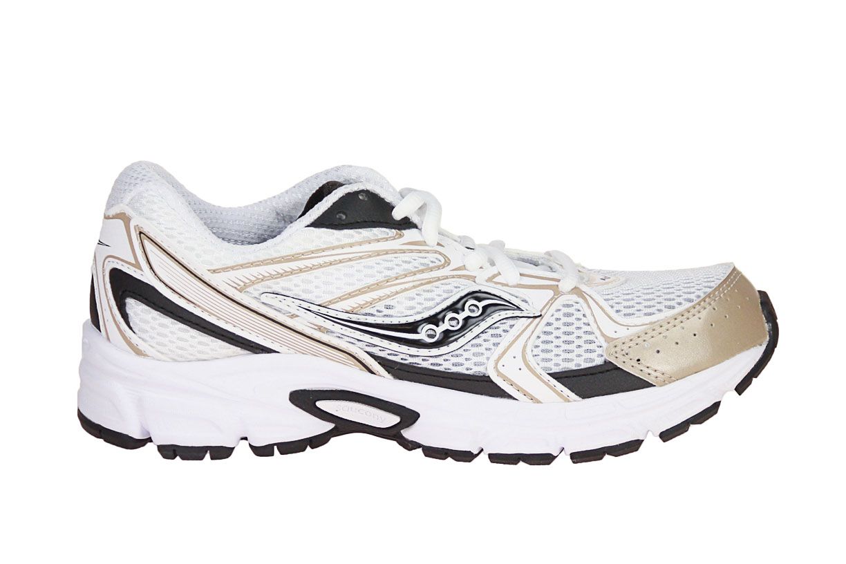 Wit textielen damessneaker met gouden accenten van het merk Saucony. De binnenzool is uitneembaar, ideaal voor steunzolen.