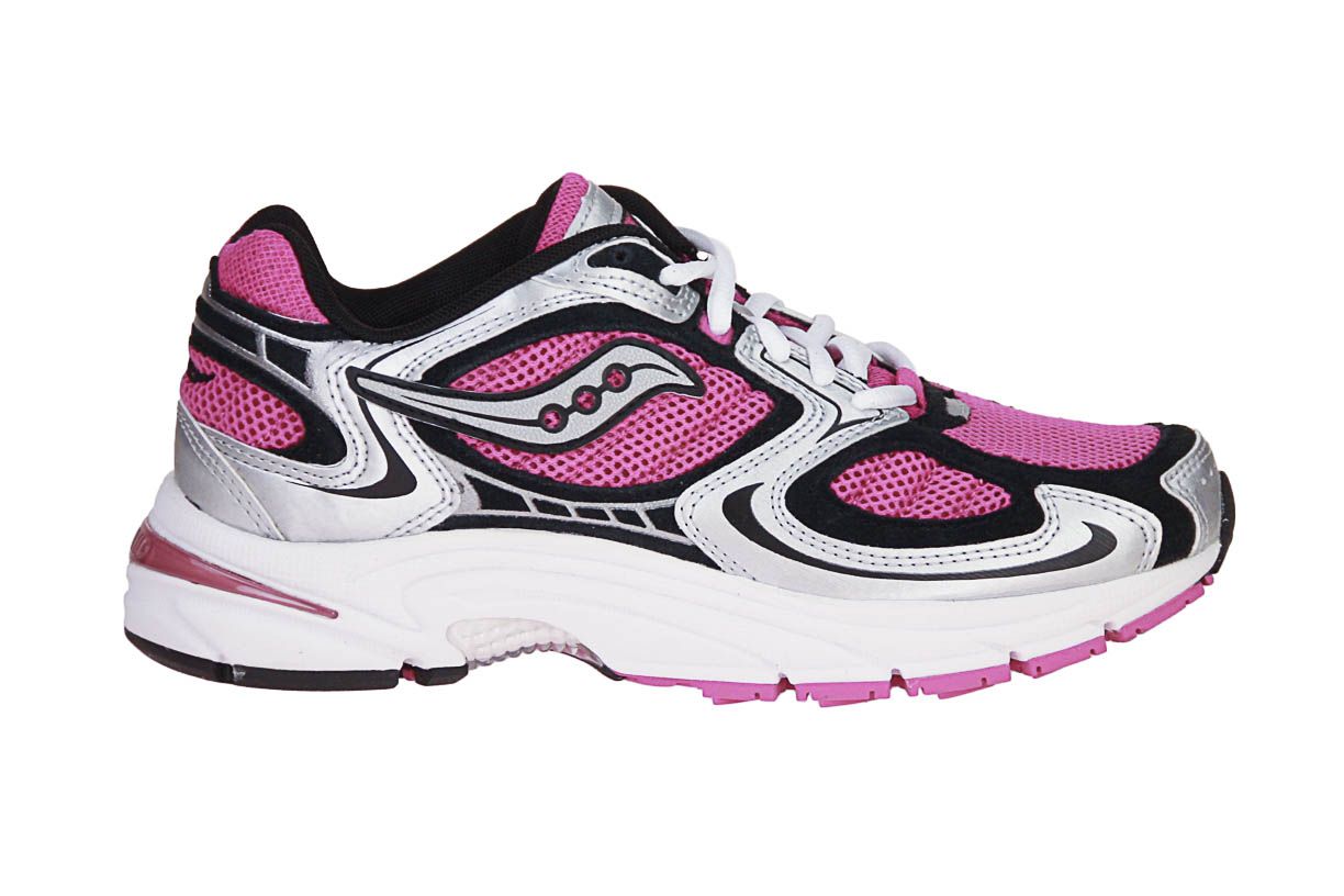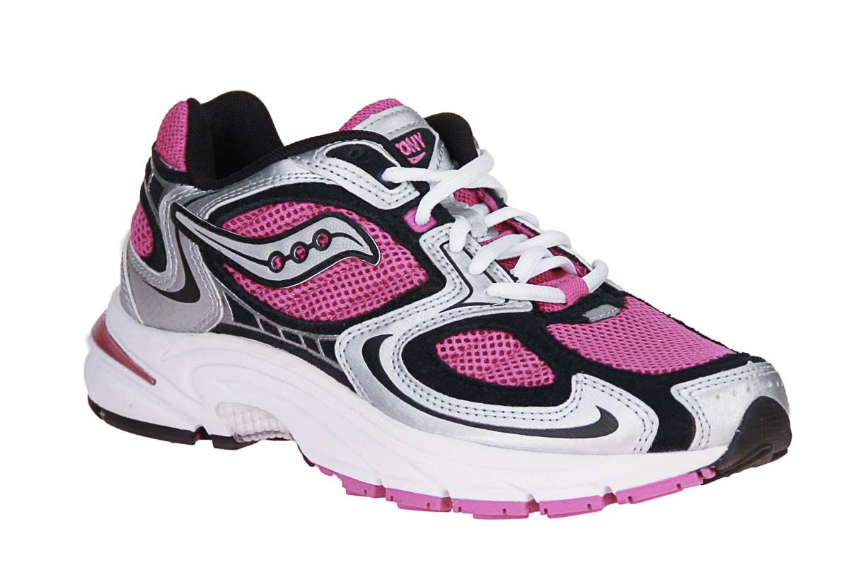 Roze textielen damesschoen met zilveren accenten van het merk Saucony. De binnenzool is uitneembaar, ideaal voor steunzolen.
