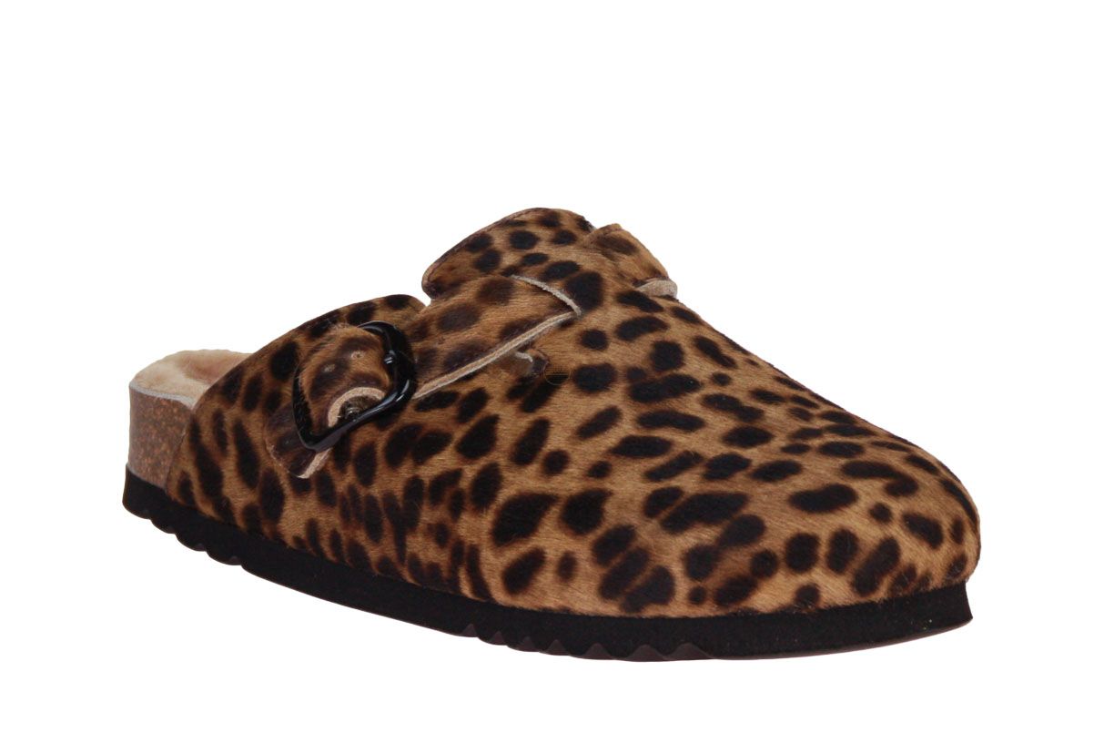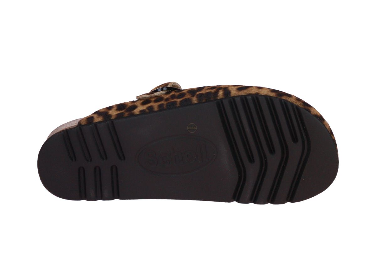 Zwart lederen slipper met panterprint van het merk Scholl. De binnenvoering is pels.