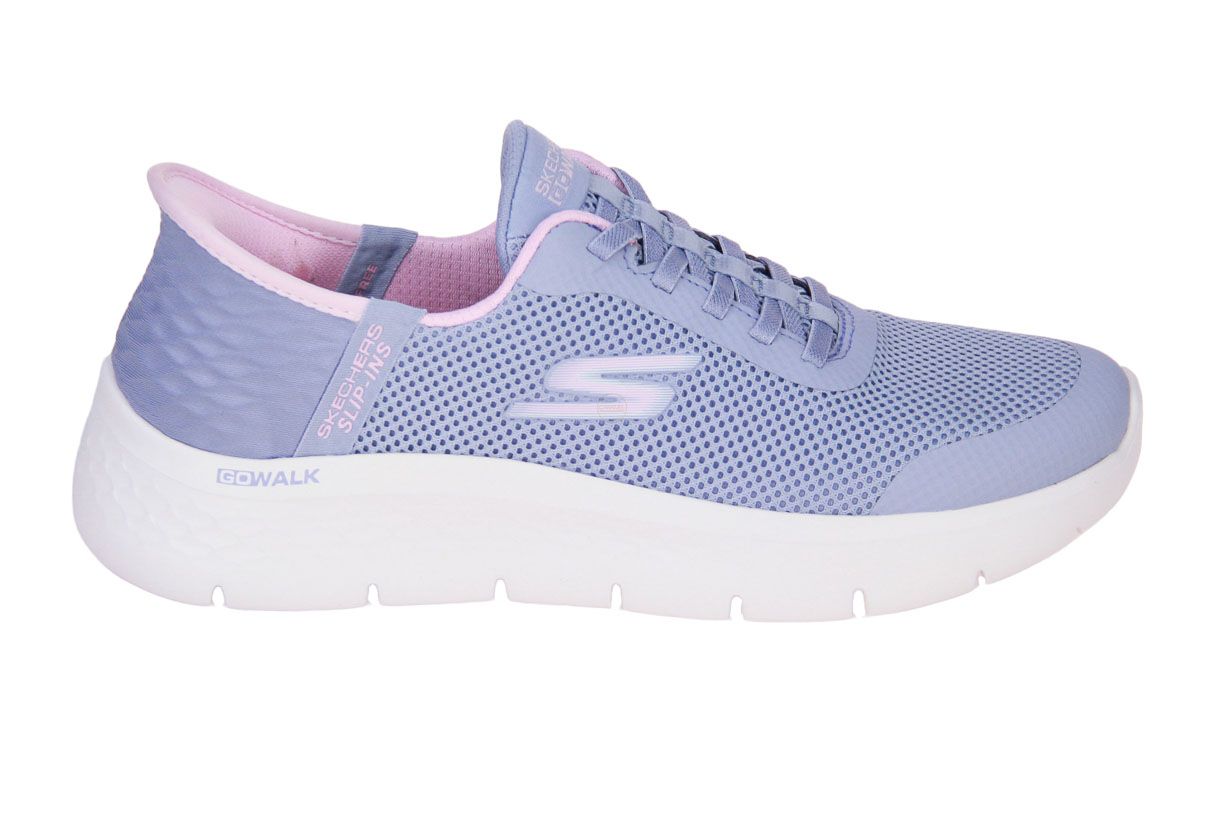 Deze lila textielen damesschoen is van het merk Skechers. Deze schoen is wasmachine bestendig.