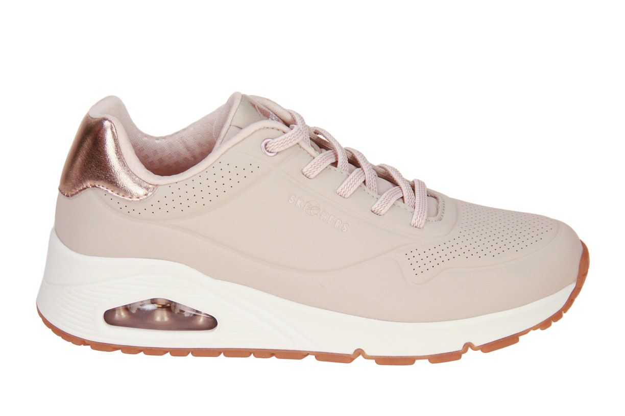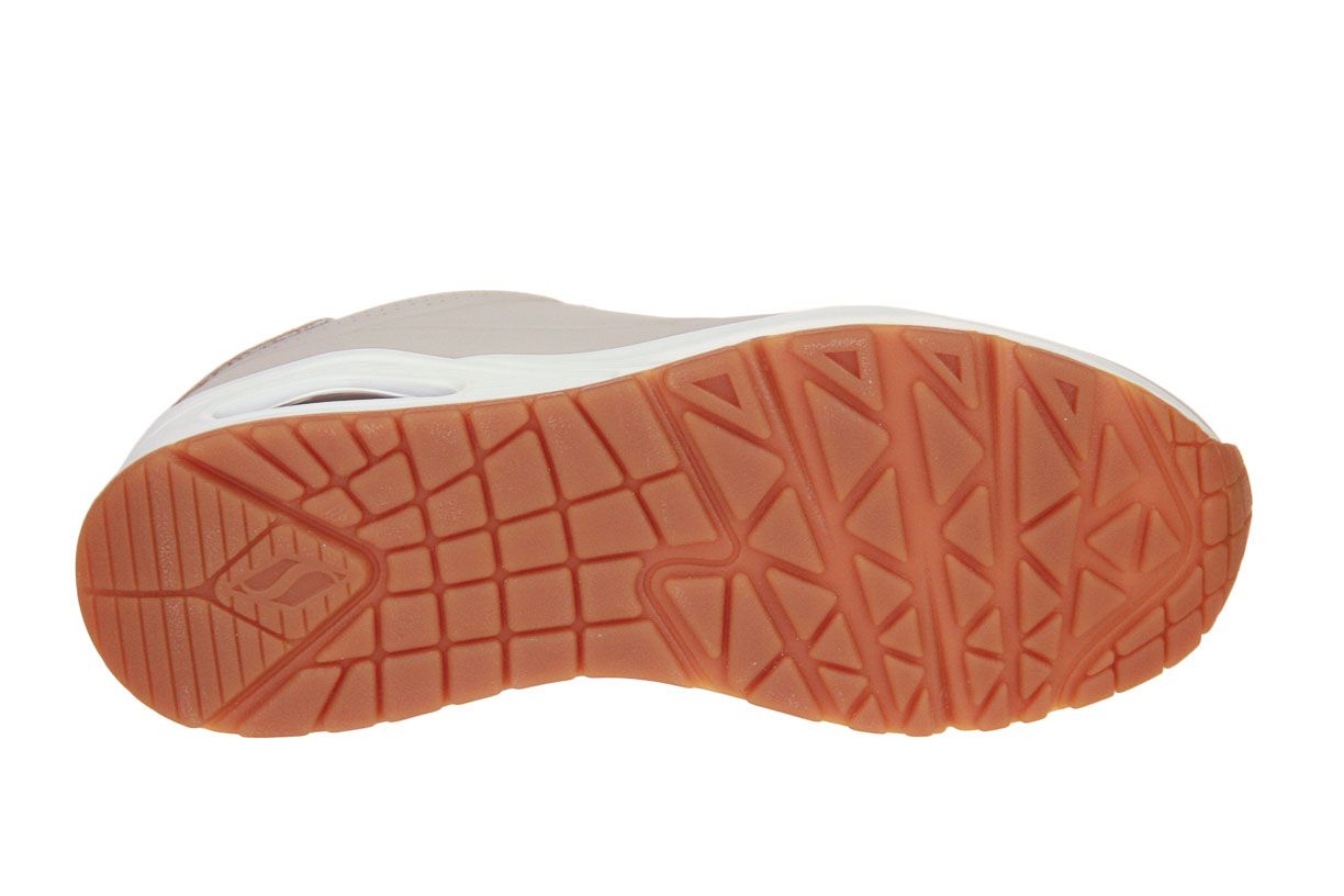 Deze beige synthetisch lederen damesschoen is van het merk Skechers.