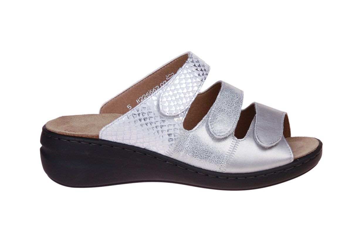 Zilver lederen damesslipper van het merk Solidus. De binnenzool is uitneembaar, ideaal voor steunzolen.