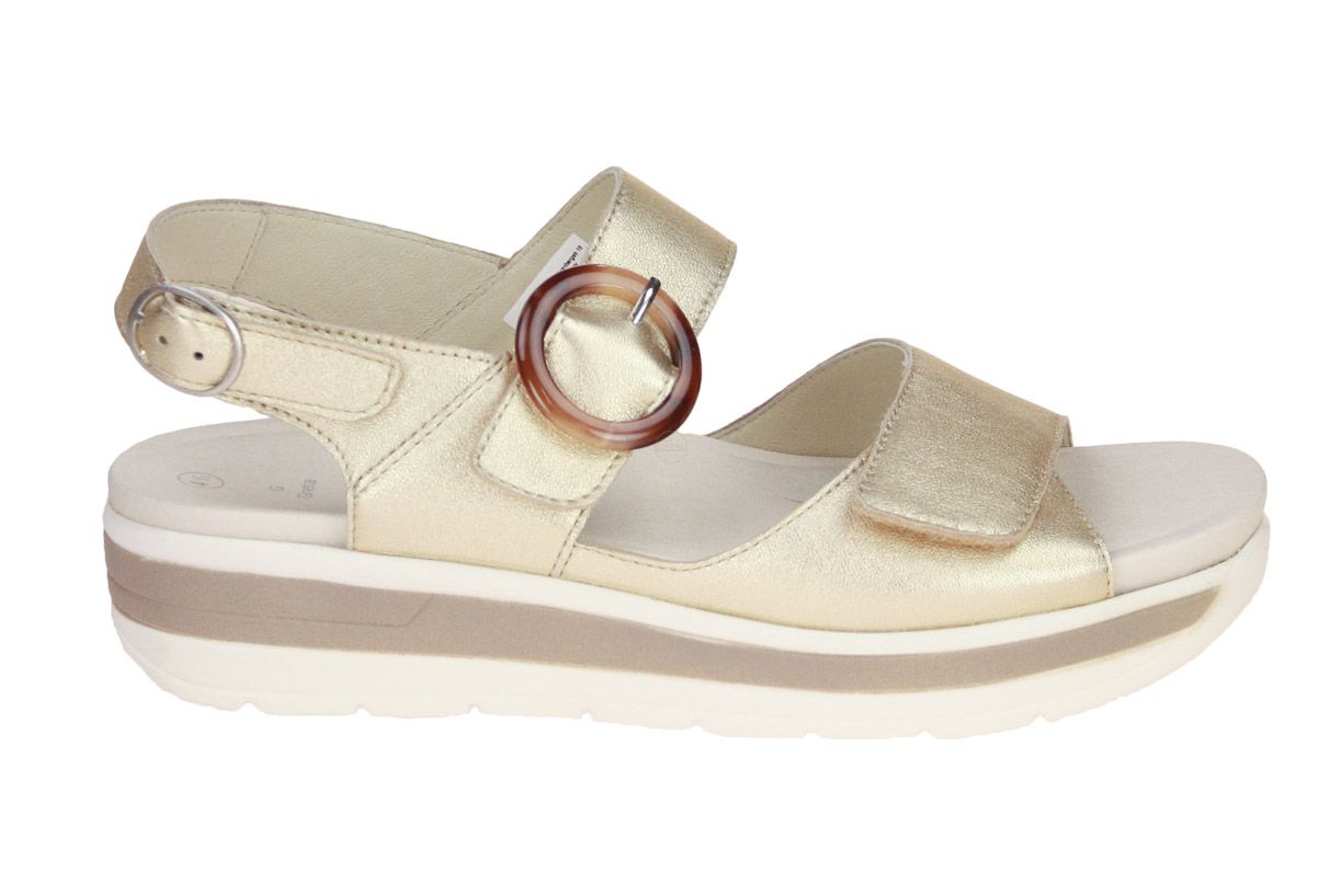 Deze goud lederen damessandaal is van het merk Solidus. De binnenzool is uitneembaar, ideaal voor steunzolen.
