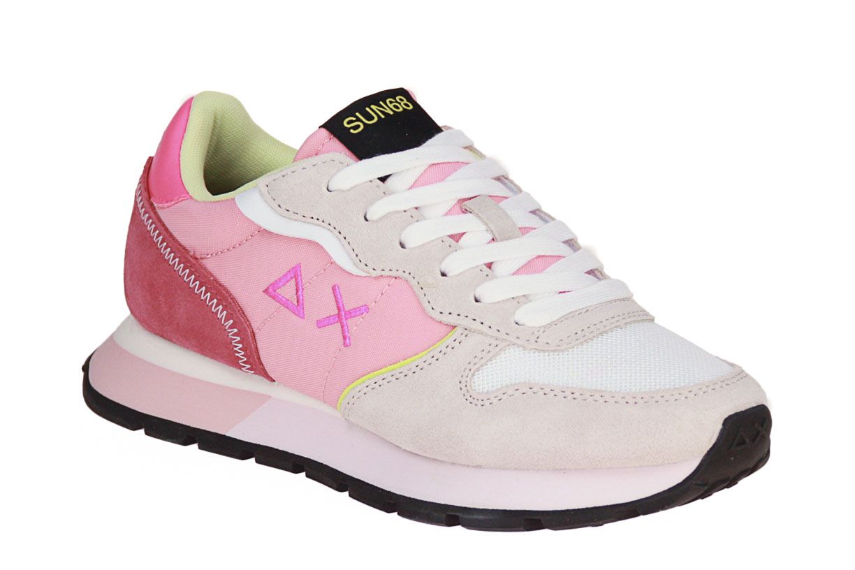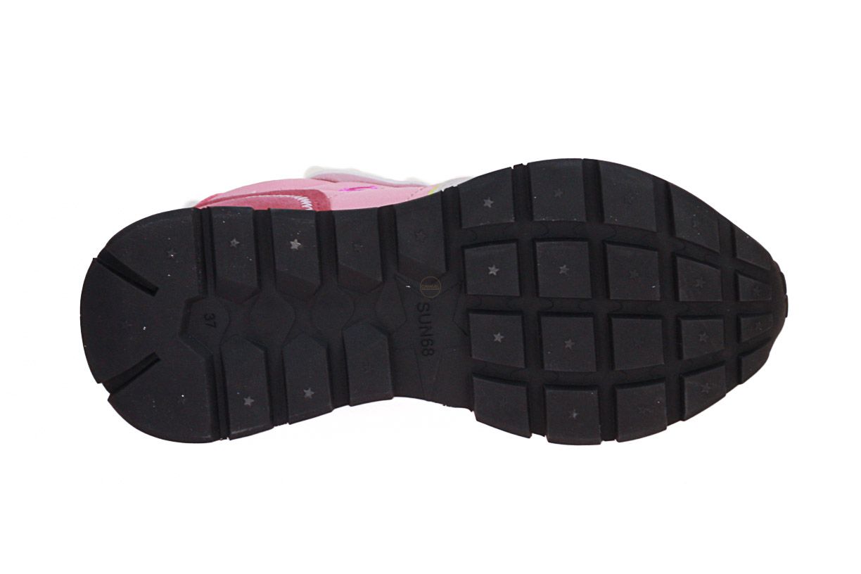 Deze roze textielen damesschoen is van het merk SUN68. De binnenzool is uitneembaar, ideaal voor steunzolen.