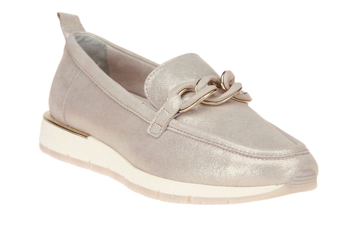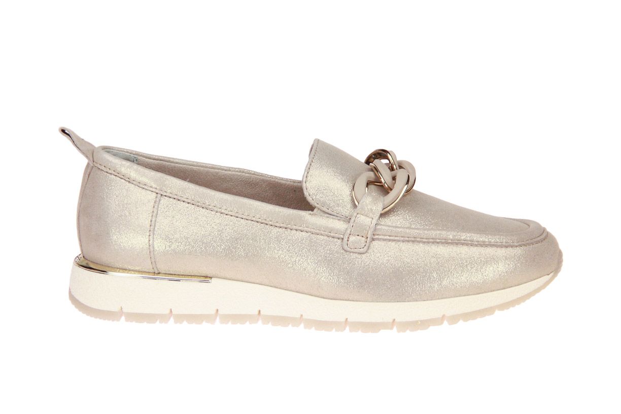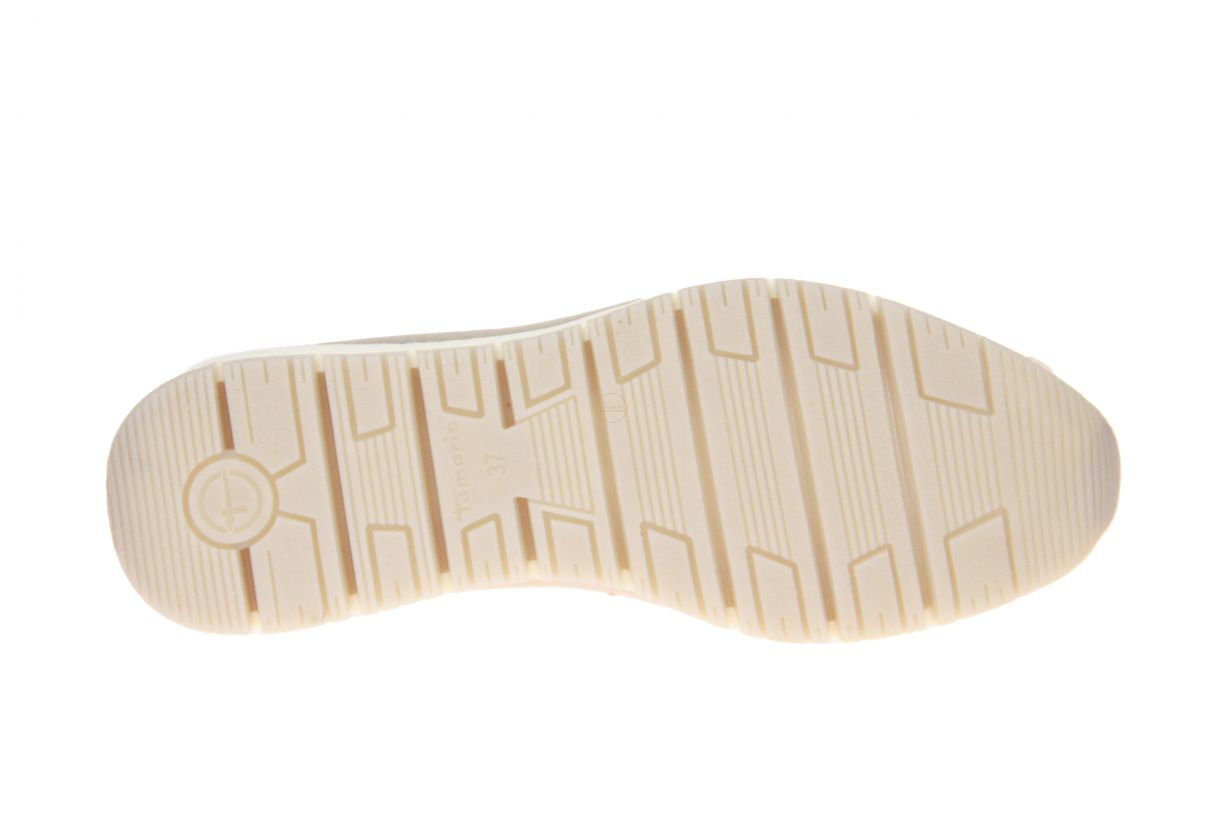 Beige suède damesschoen met goud metallic accenten van het merk Tamaris. De binnenzool is uitneembaar, ideaal voor steunzolen.
