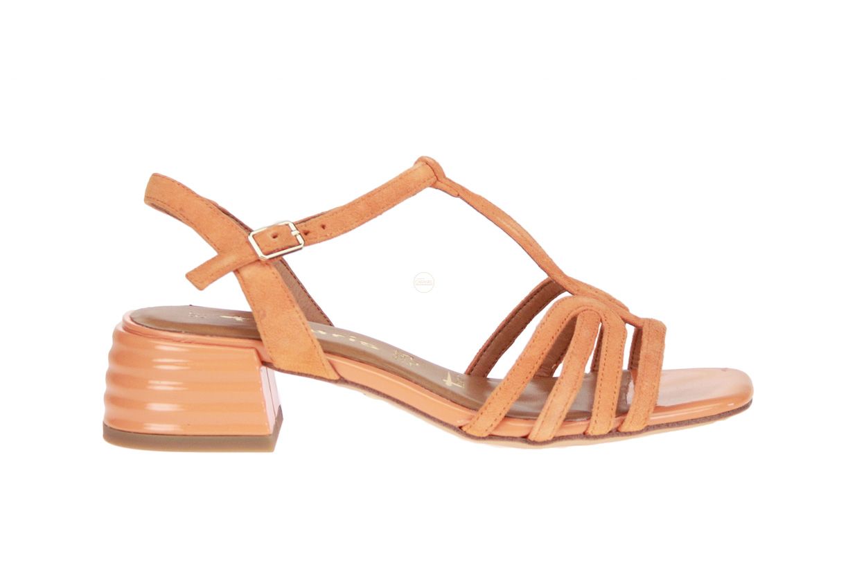 Oranje suède damessandaal van het merk Tamaris. Het hakje is afgewerkt in het lakleder.