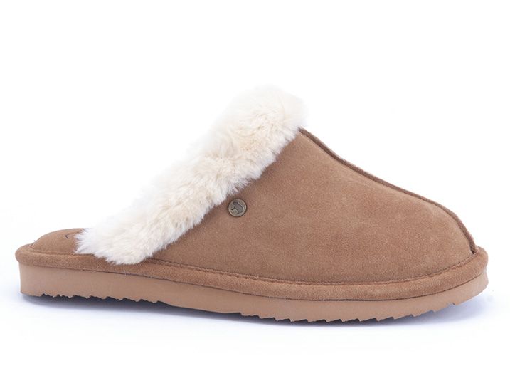 Cognac suede damespantoffel van het merk Warmbat.