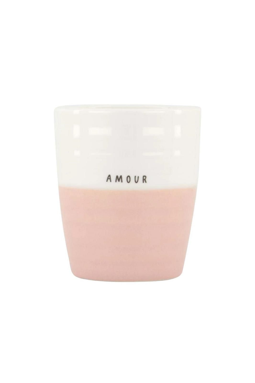 Wit/Roze .De koffiemok heeft een diameter van 7,5cm en is 8,5cm hoog