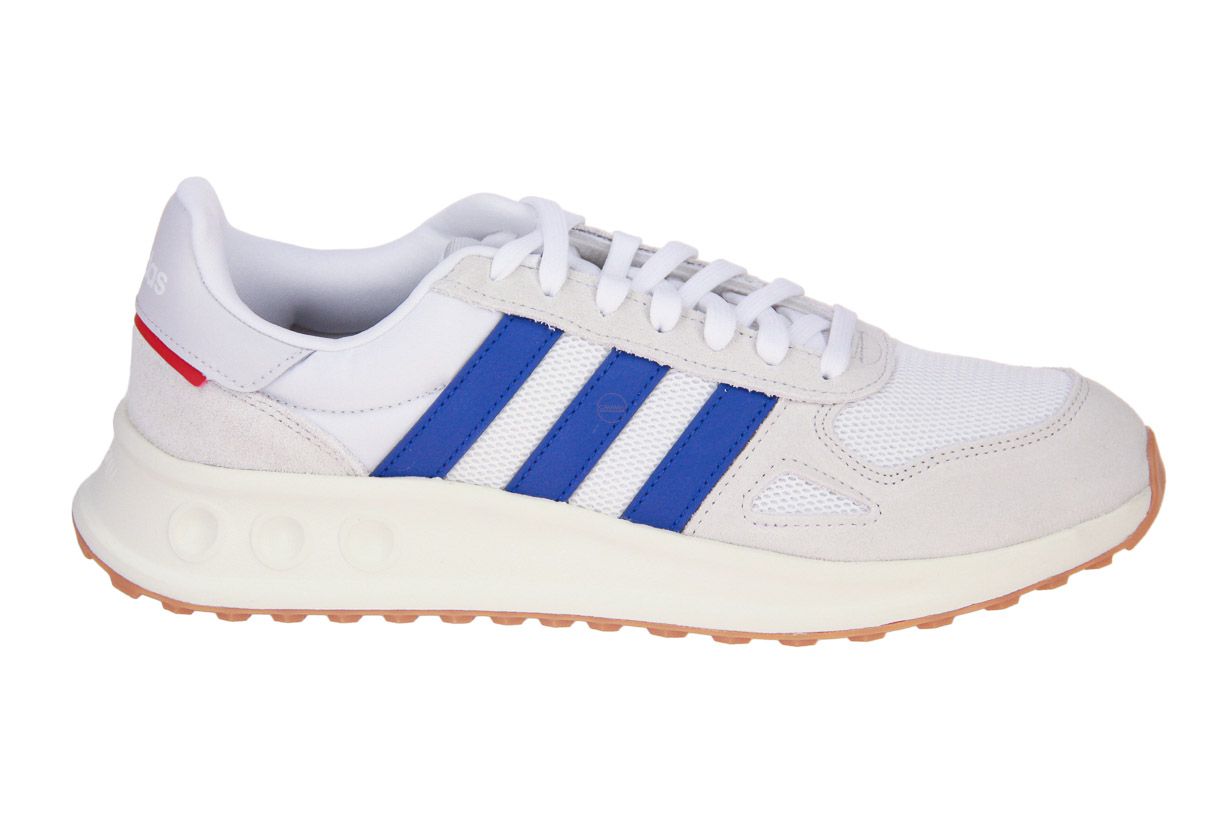Deze offwhite suède sneaker met blauwe accenten is van het merk Adidas. De binnenzool is uitneembaar, ideaal voor steunzolen.