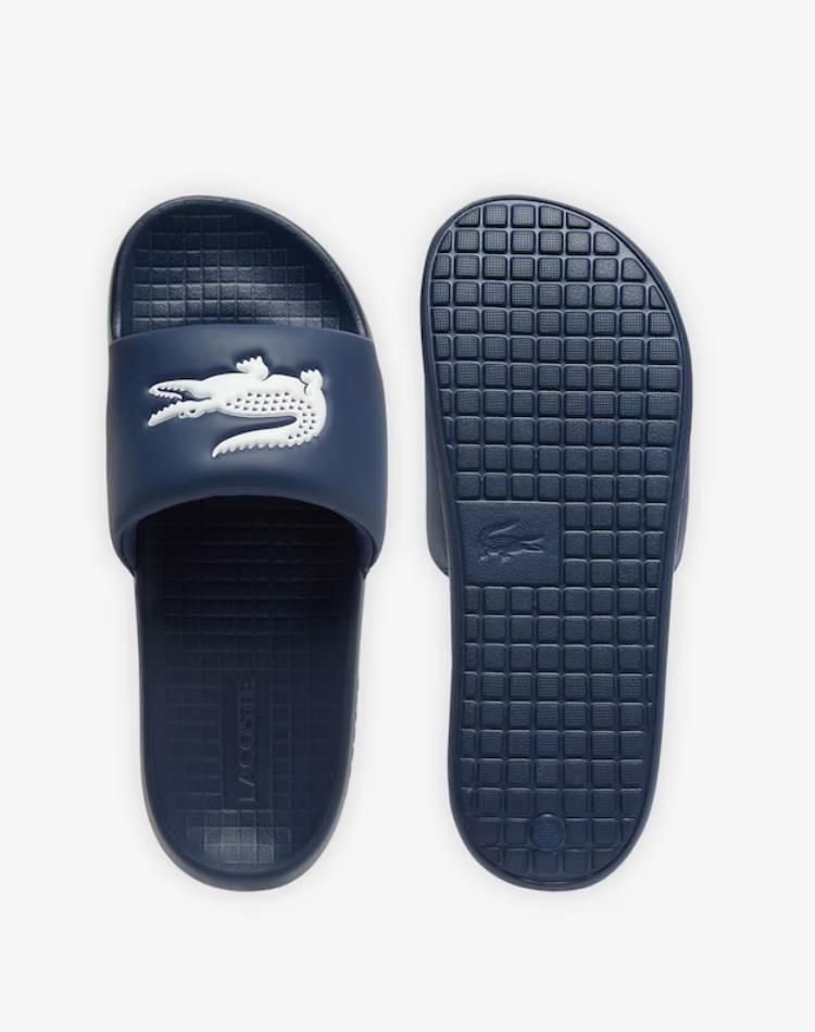 Deze blauw rubberen slipper is van het merk Lacoste.