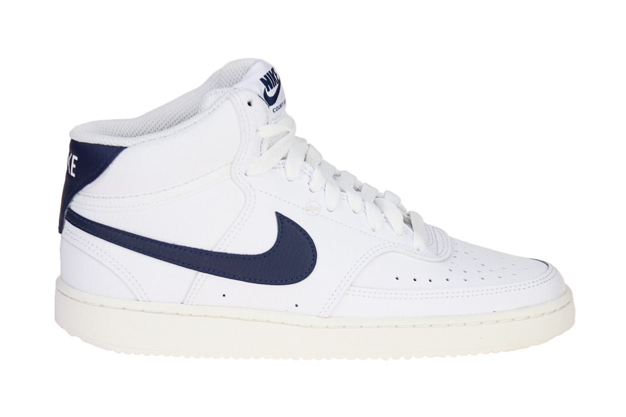 Deze wit lederen sneaker met blauwe accenten is van het merk Nike.