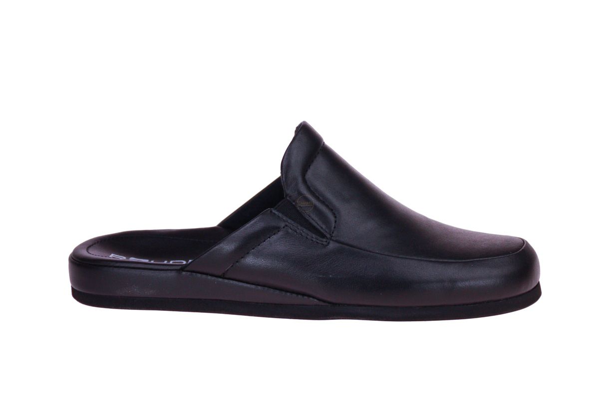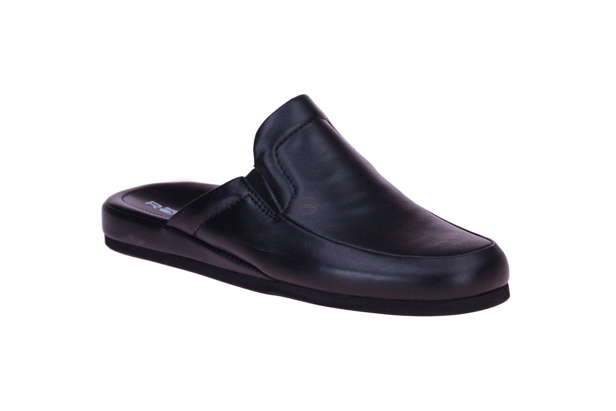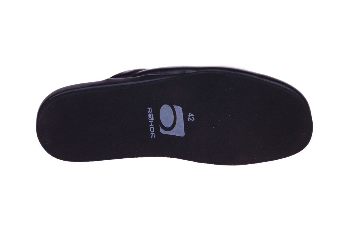 Zwart lederen herenpantoffel van het merk Rohde. Deze zool laat geen zwarte strepen op parket.