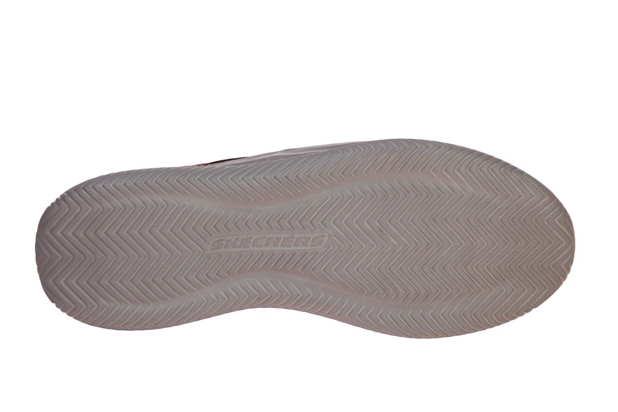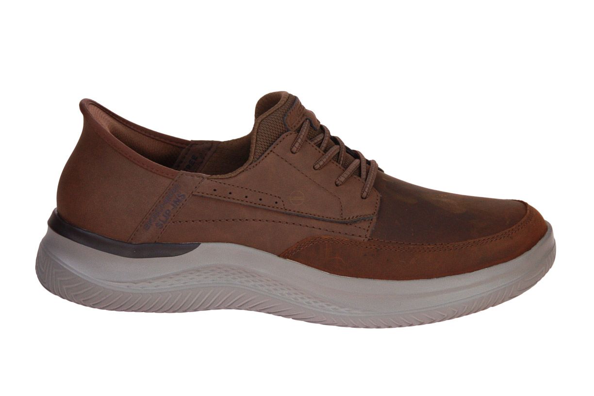 Deze bruin gevet lederen herenschoen is van het merk Skechers.