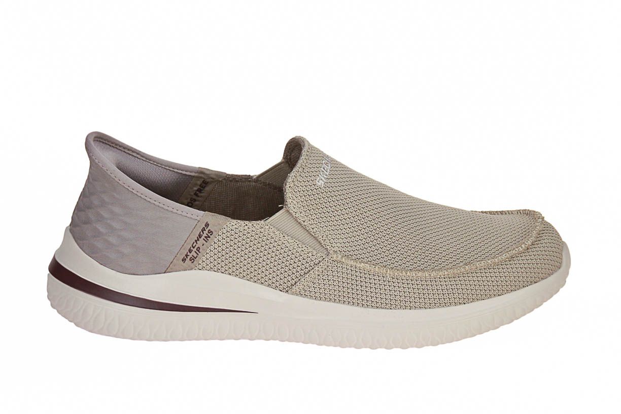 Deze taupe vegan herenschoen is van het merk Skechers. Deze schoen is wasmachine bestendig.