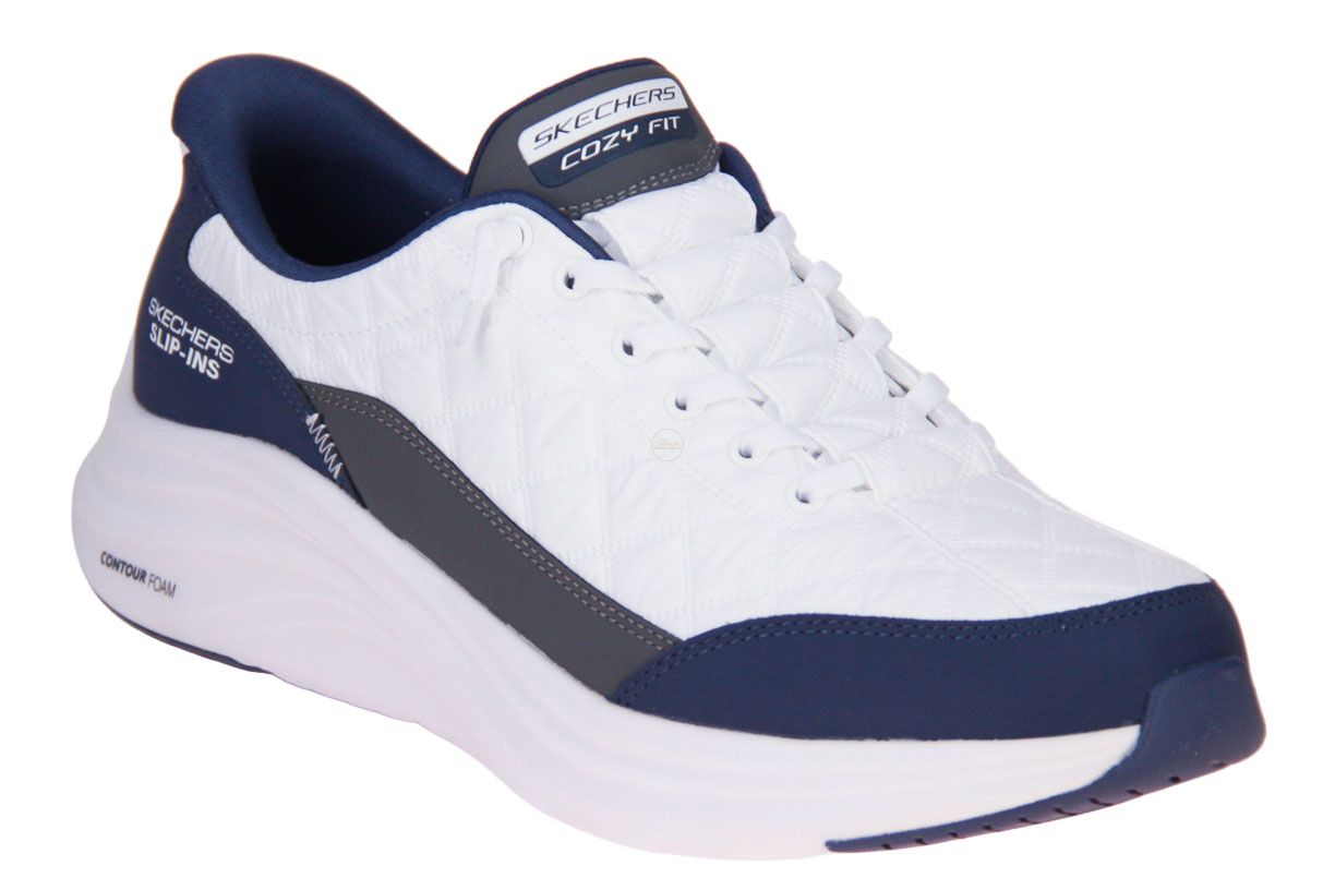 Deze wit textielen herenschoen is van het merk Skechers. Deze schoen is wasmachine bestendig.