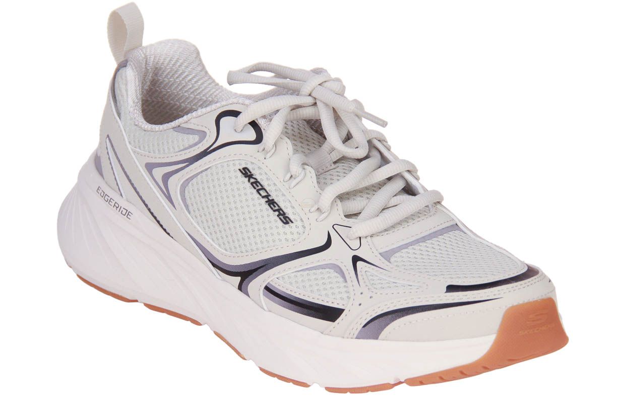 Deze beige textielen herenschoen is van het merk Skechers. De schoen is wasmachine bestendig.