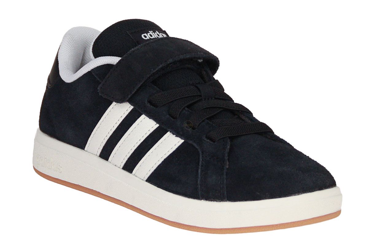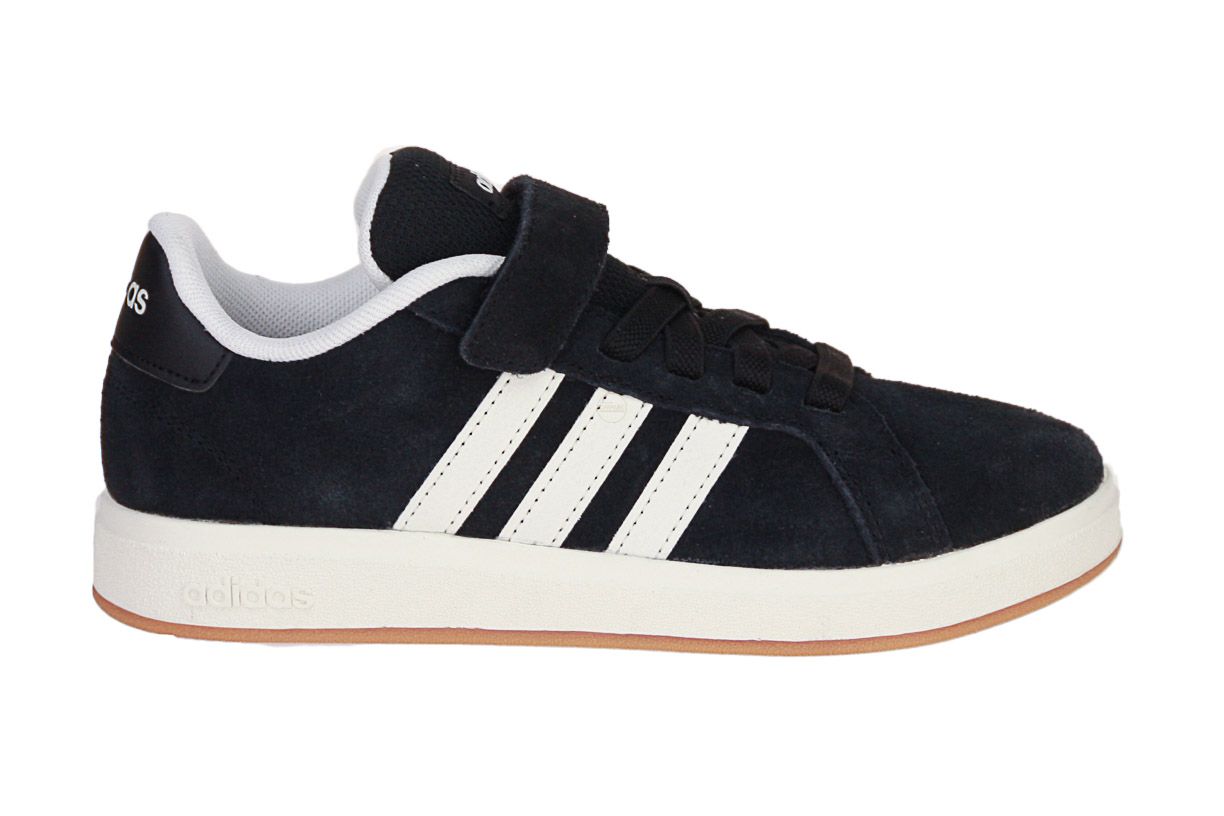 Zwart synthetisch suède sneaker met witte accenten van het merk Adidas.