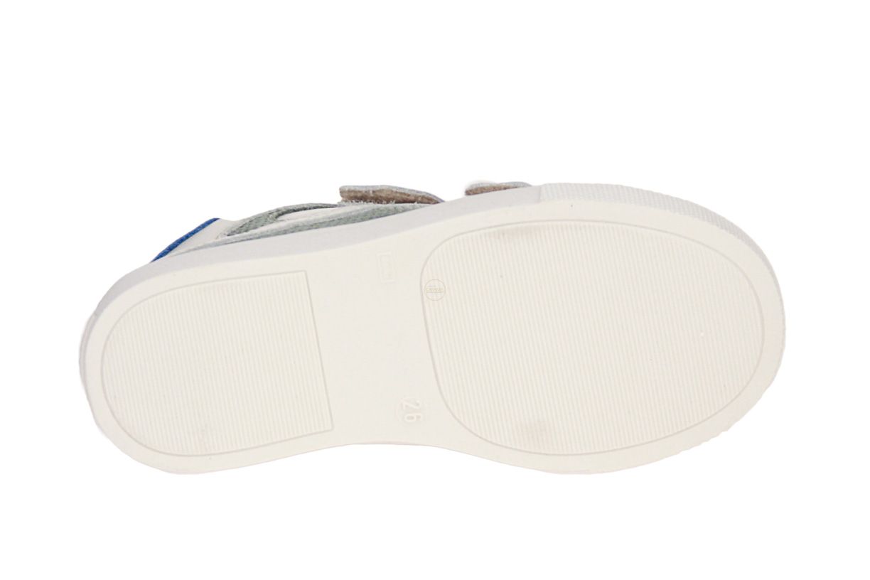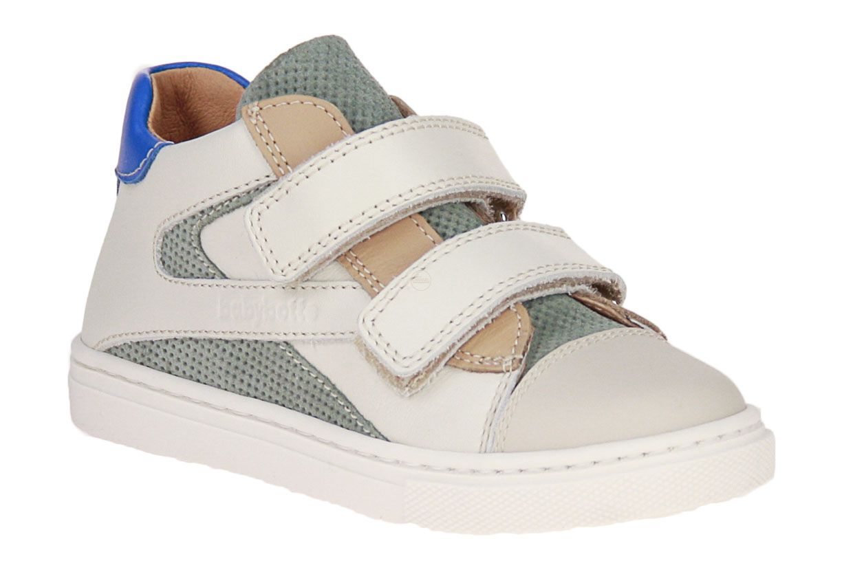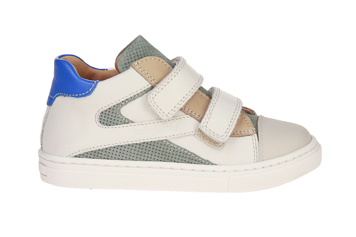 Beige lederen jongensschoen met groen suède accenten van het merk Babybotte.