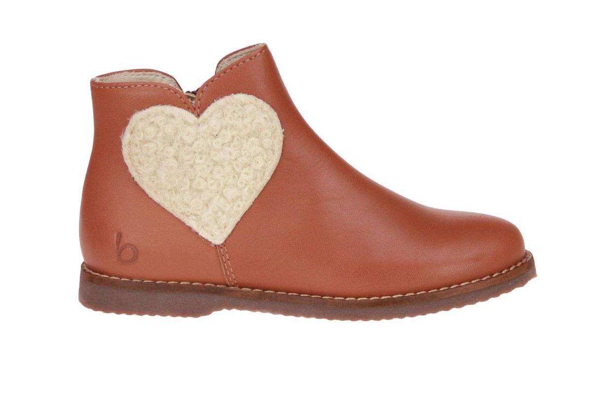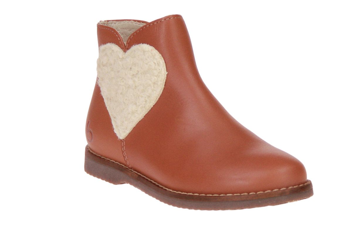 Camel korte lederen meisjeslaars van het merk Beberlis. Het laarsje is afgewerkt met een wollen hartje.