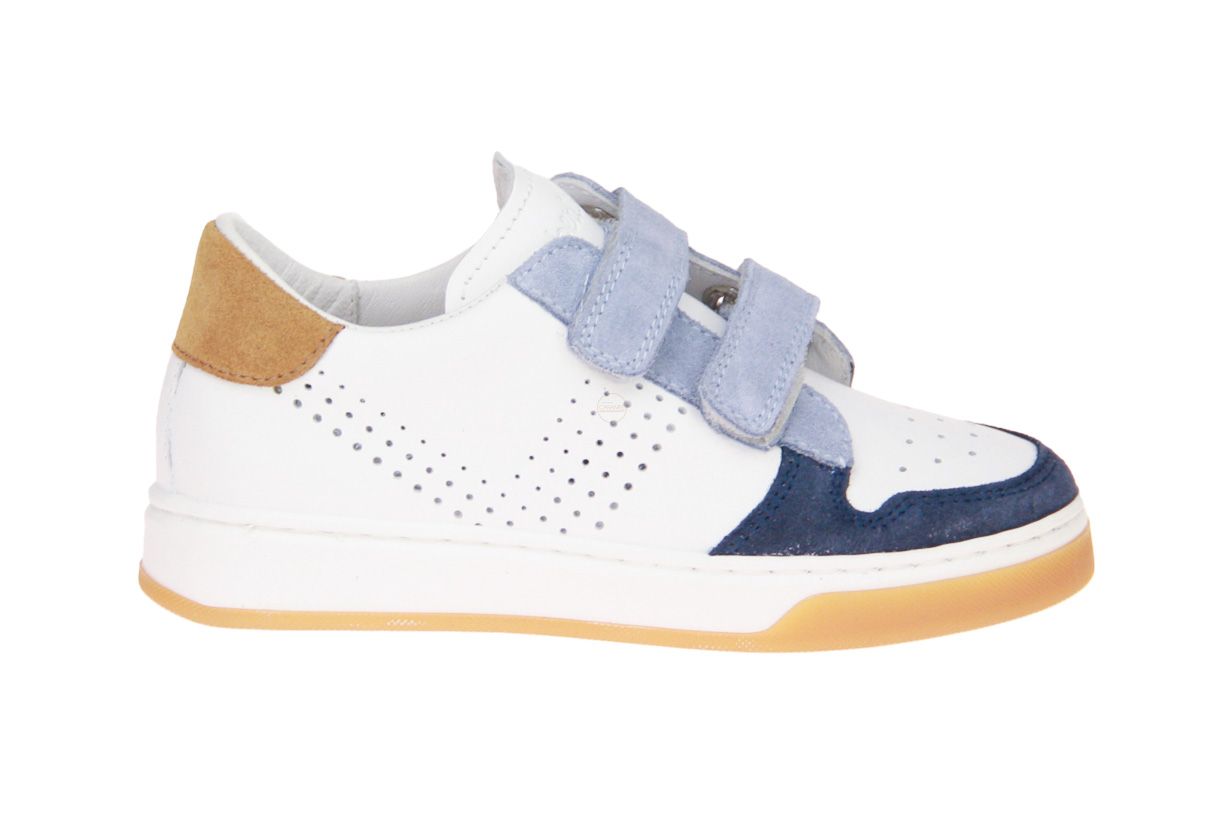 Wit lederen jongensschoen met blauw suède accenten van het merk Beberlis.