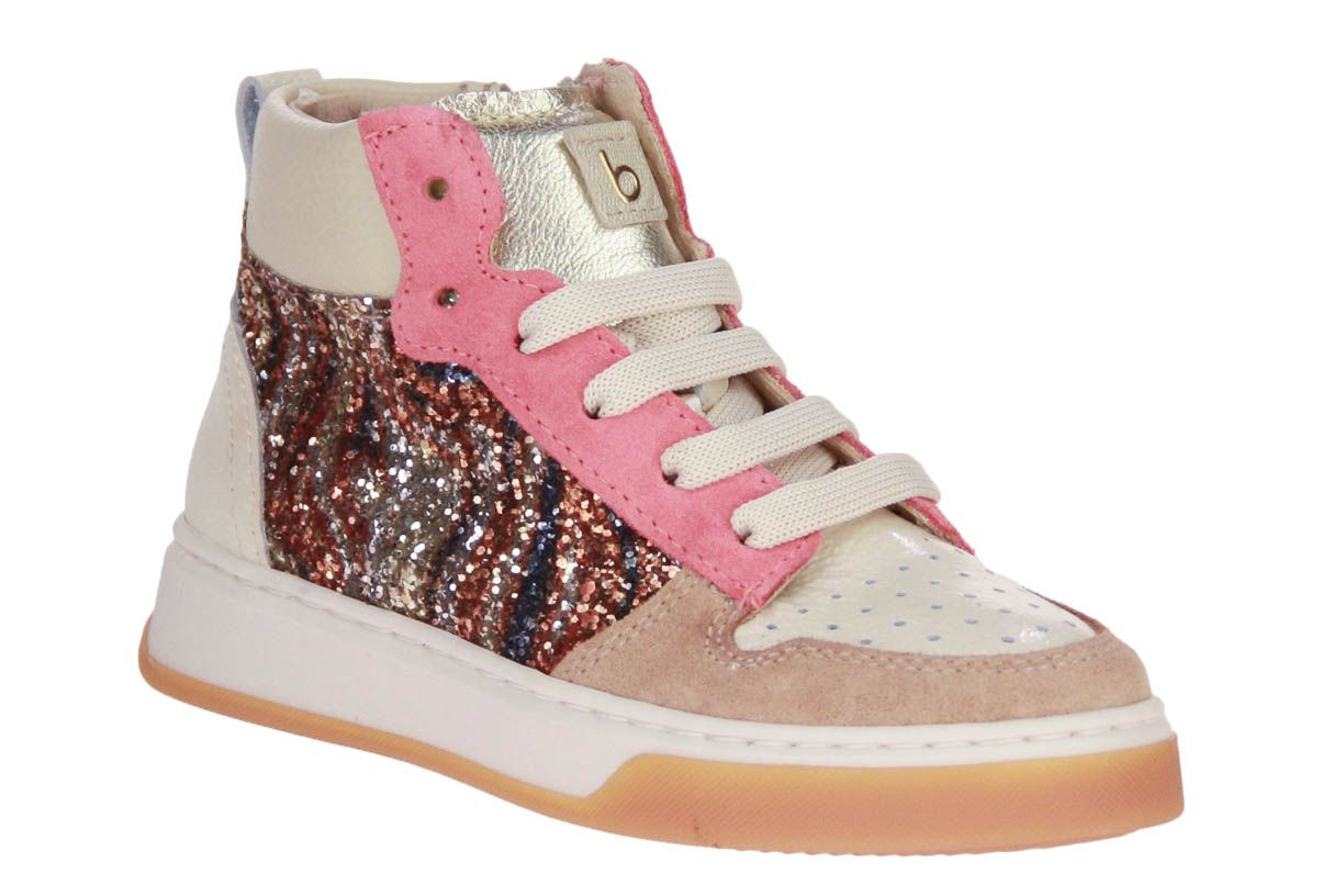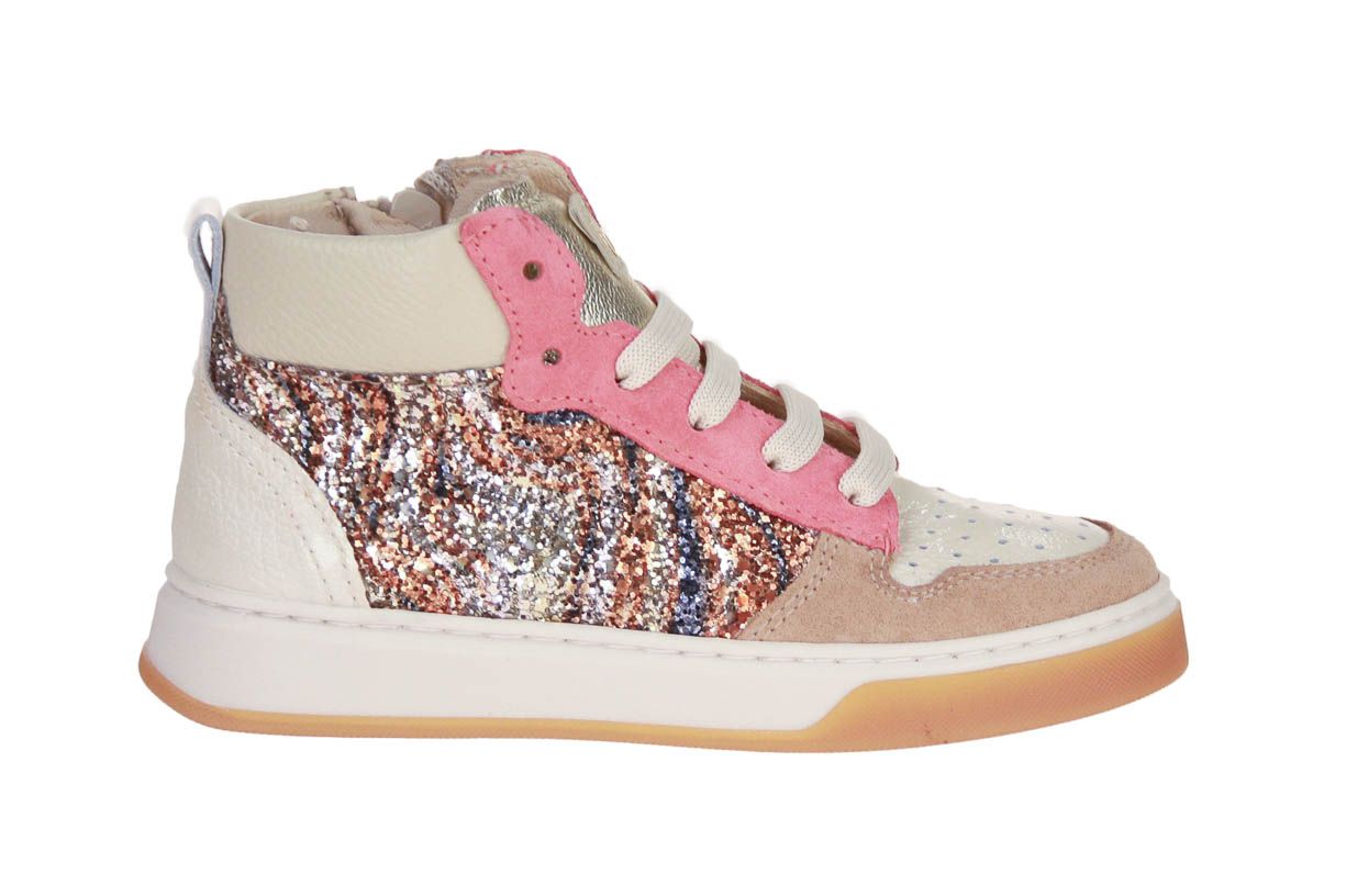 Beige lederen meisjesschoen met glitter accenten van het merk Beberlis. De binnenzool is uitneembaar, ideaal voor steunzolen.