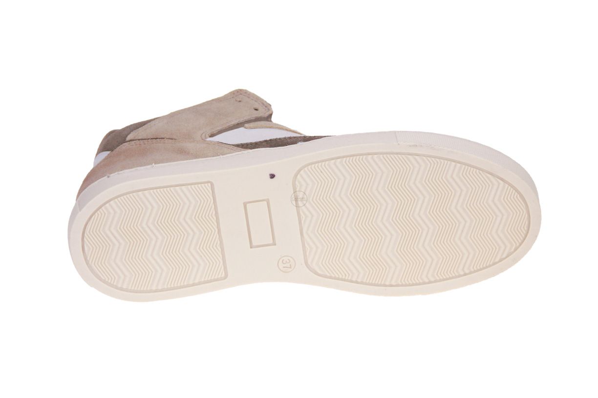 Beige nubuck/suède jongensschoen met groene accenten van het merk CKS. De binnenzool is uitneembaar, ideaal voor steunzolen.