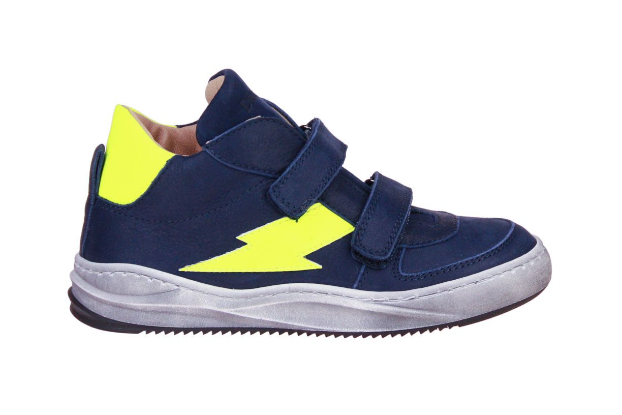 Blauw lederen jongensschoen met fluo gele accenten van het Italiaanse merk Dianetti. De binnenzool is uitneembaar, ideaal voor steunzolen.