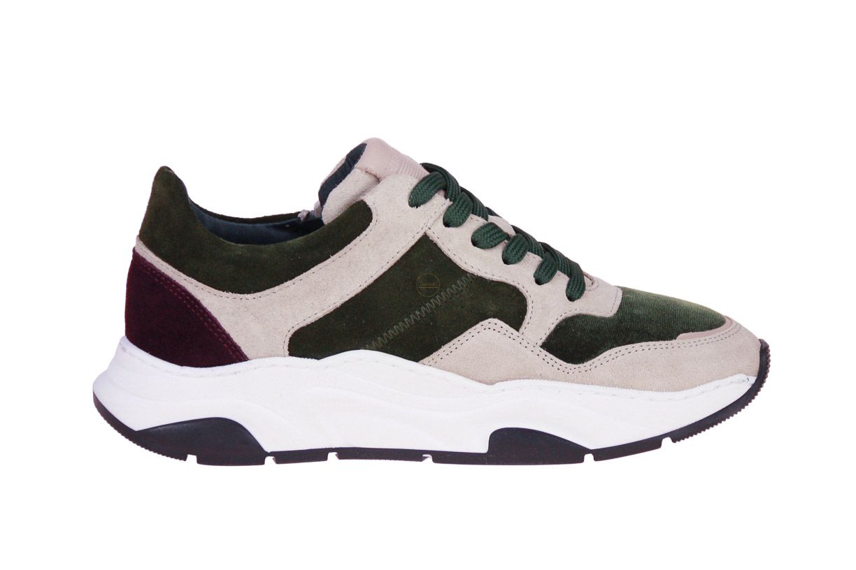 Beige suède meisjesschoen met groen velvet accenten van het merk Hip. De binnenzool is uitneembaar, ideaal voor steunzolen.