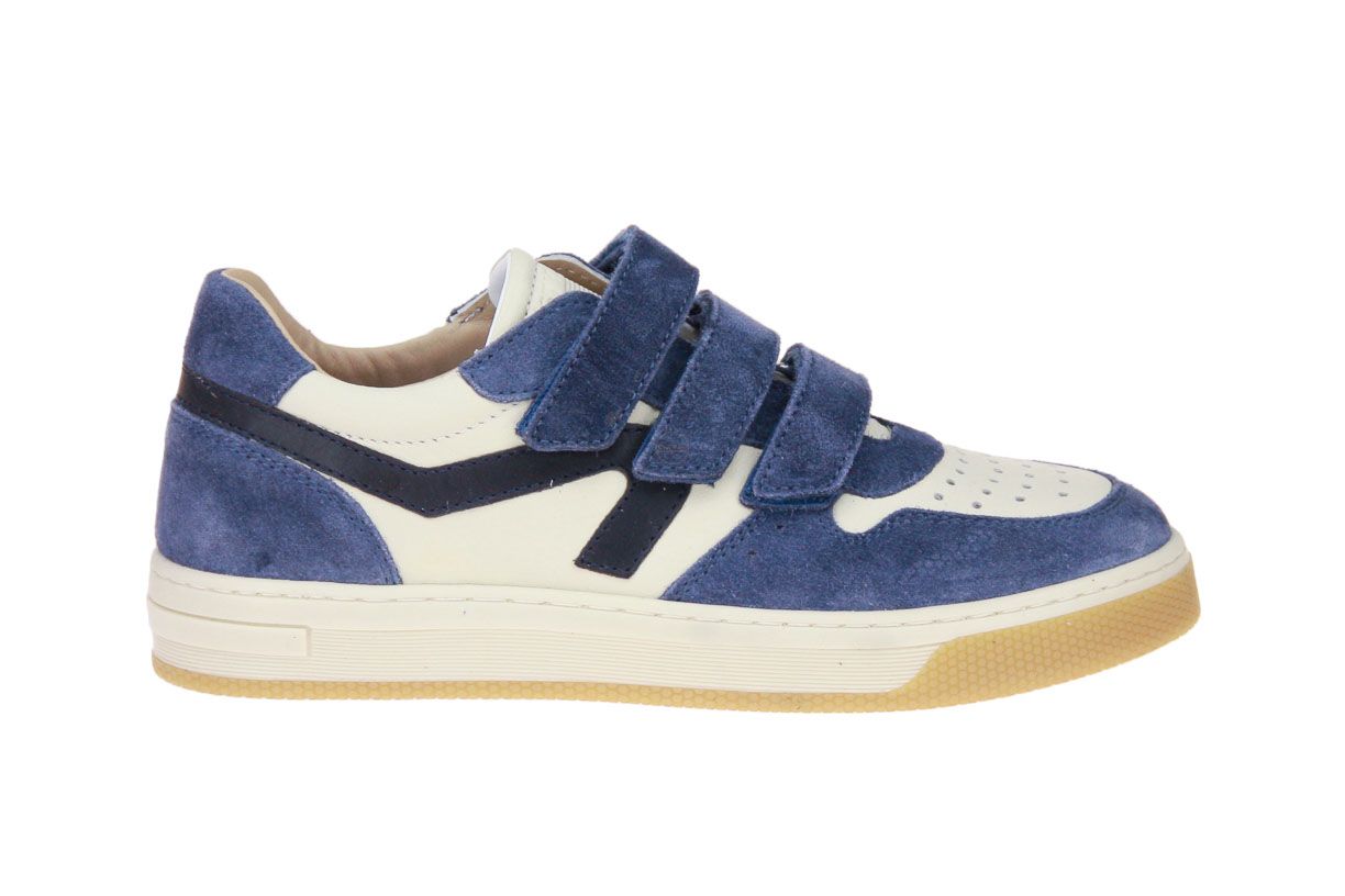Beige lederen jongensschoen met blauwe accenten van het merk Hip. De binnenzool is uitneembaar, ideaal voor steunzolen.