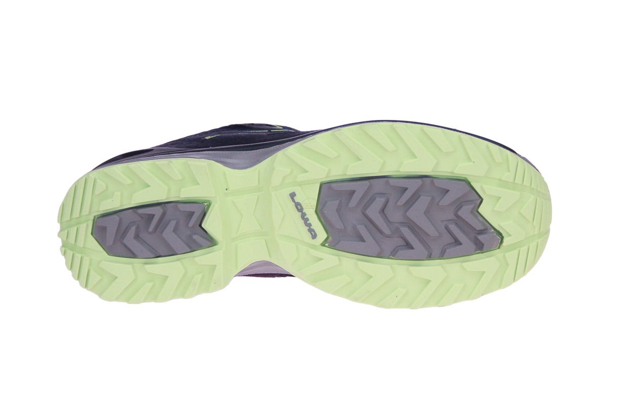 Blauw textielen wandelschoen met groene accenten van het merk Lowa.