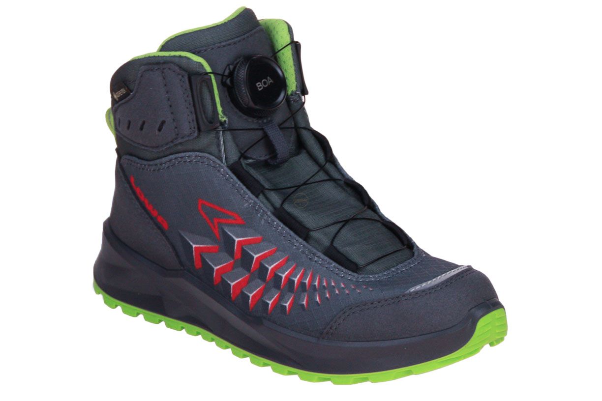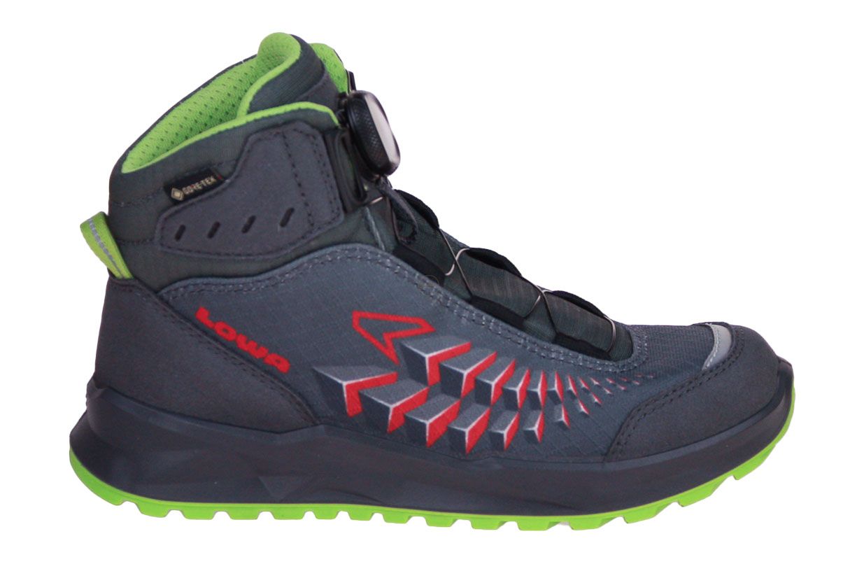 Deze grijze textielen outdoorschoen is van het merk Lowa. Dit model is waterdicht. De binnenzool is uitneembaar, ideaal voor steunzolen.