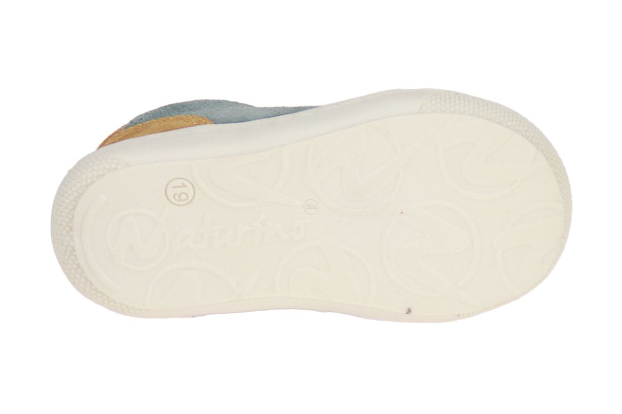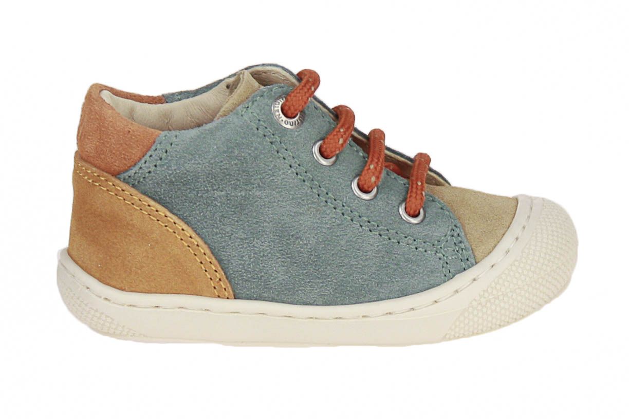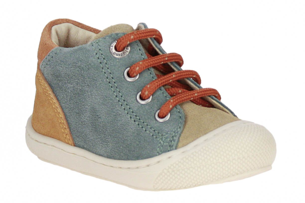 Deze beige suède jongensschoen met blauwe accenten is van het merk Naturino. Dit schoentje is ideaal om te leren stappen.