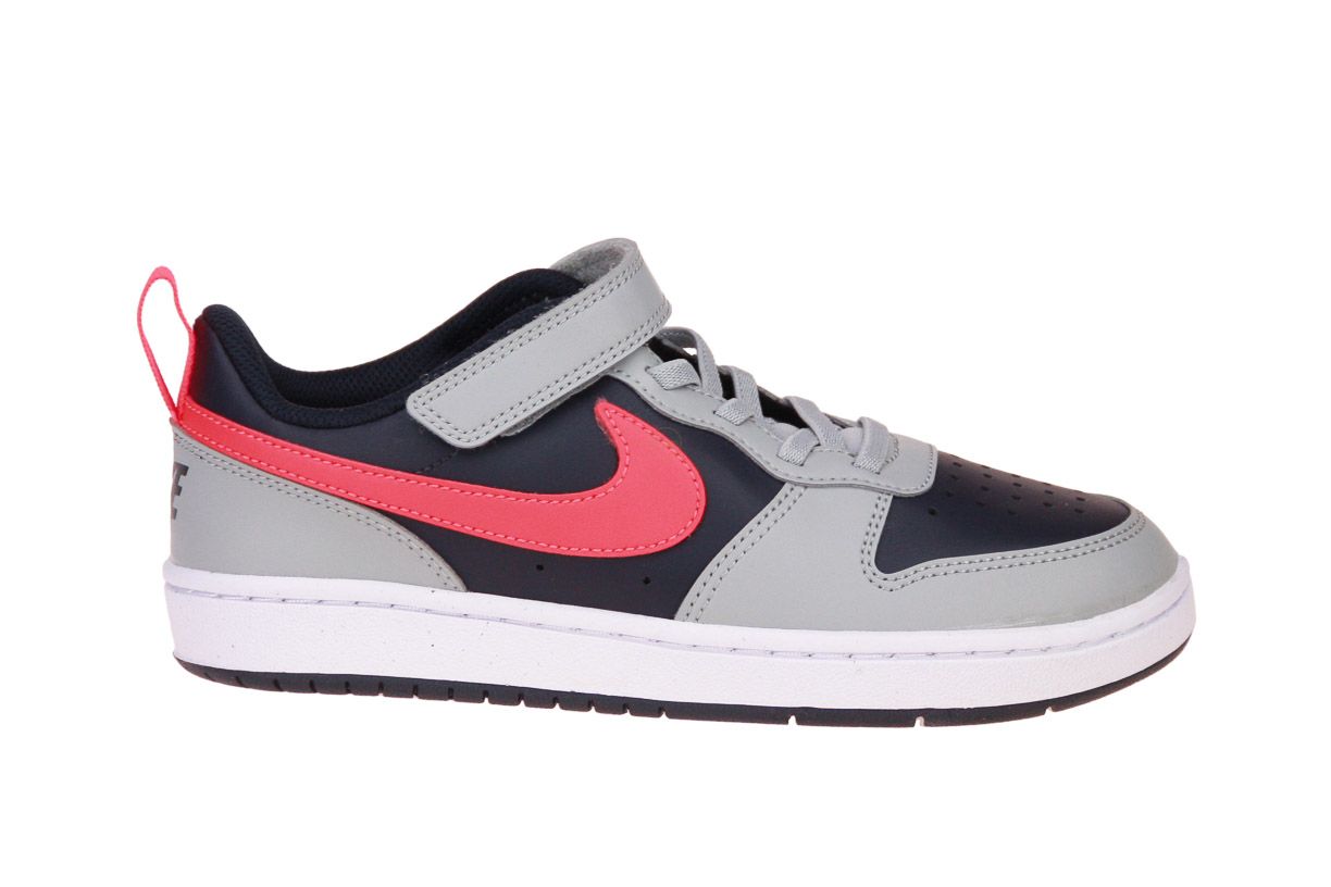 Grijs synthetisch lederen sneaker met blauw en rode accenten van het merk Nike.
