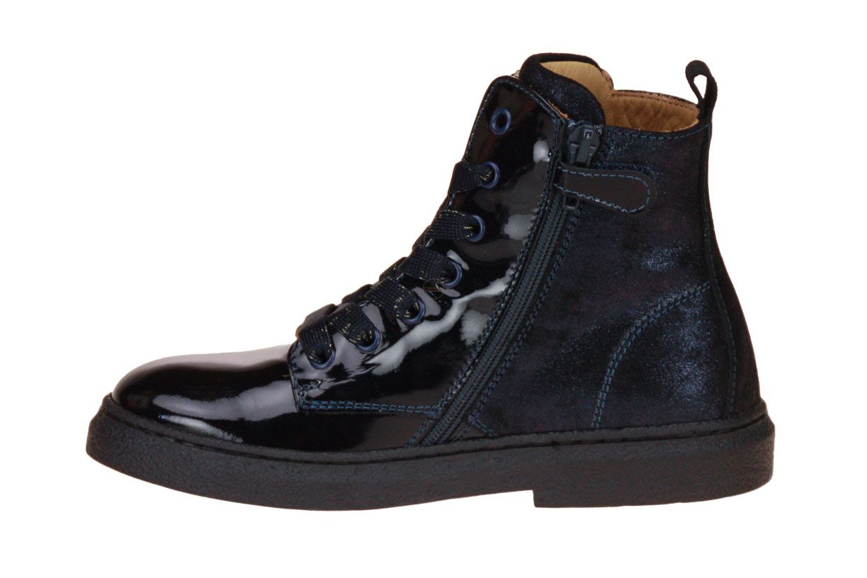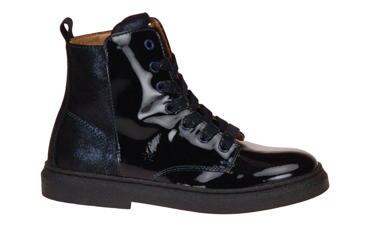 Blauw laklederen korte meisjeslaars van het merk Stones and Bones. De binnenzool is uitneembaar, ideaal voor steunzolen.