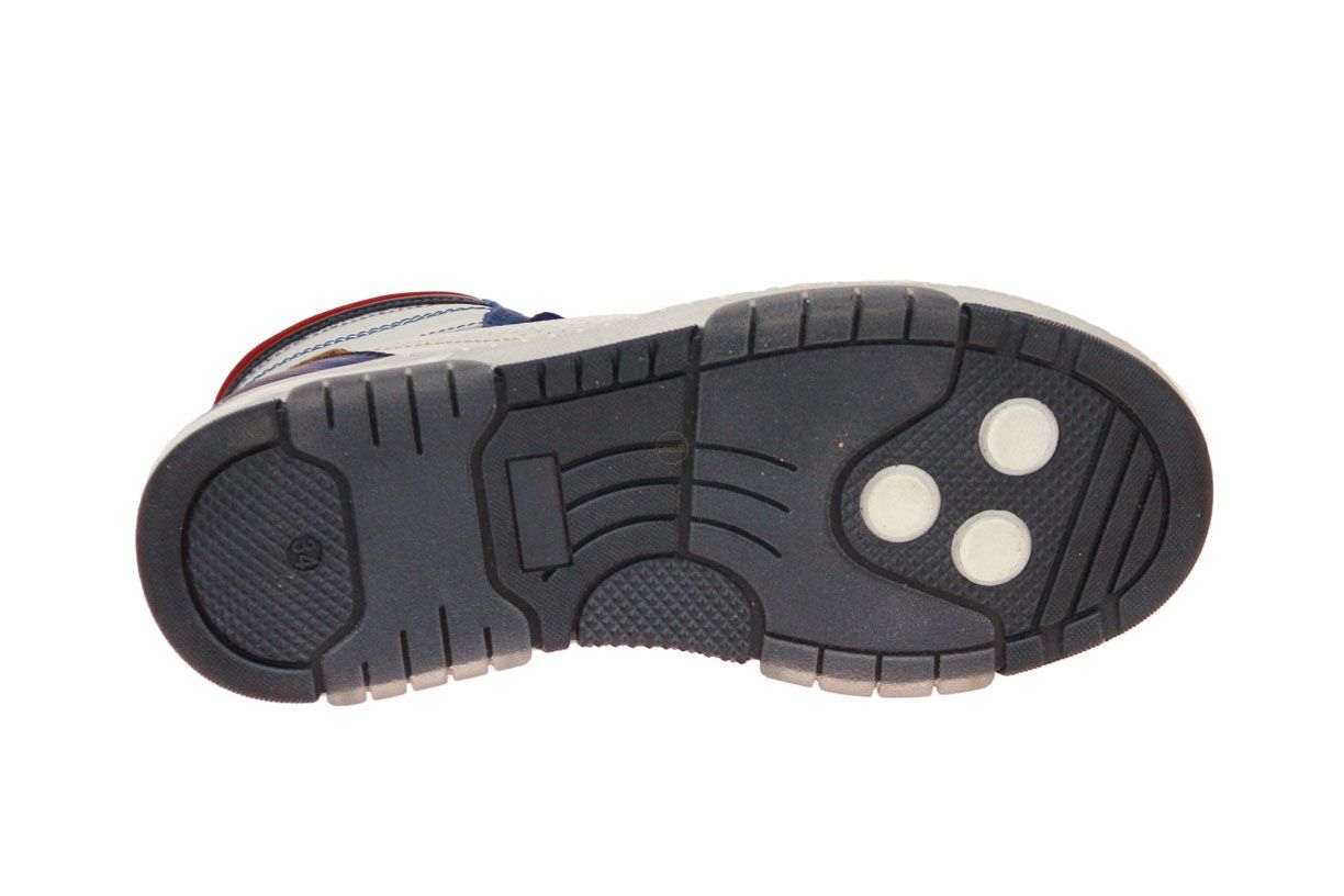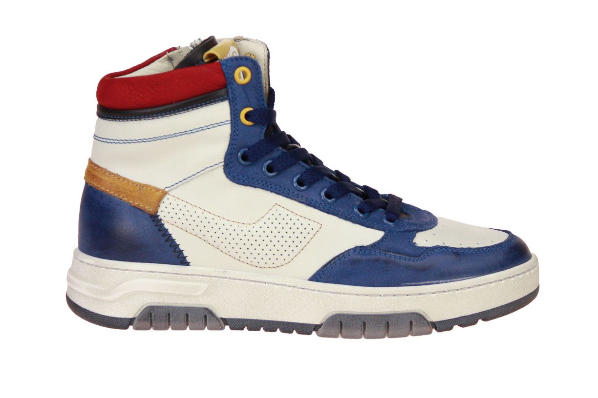Blauw lederen hoge jongensschoen met offwhite accenten van het merk Stones and Bones. De binnenzool is uitneembaar, ideaal voor steunzolen.
