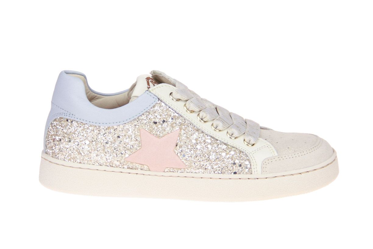Beige suède meisjesschoen met gouden glitters van het merk Stones and Bones. De binnenzool is uitneembaar, ideaal voor steunzolen.