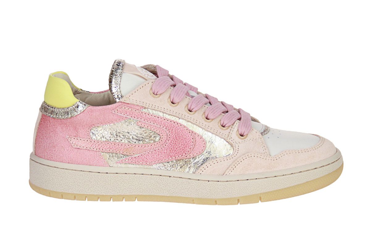 Roze lederen meisjesschoen met metallic accenten van het merk Stones and Bones. De binnenzool is uitneembaar, ideaal voor steunzolen.