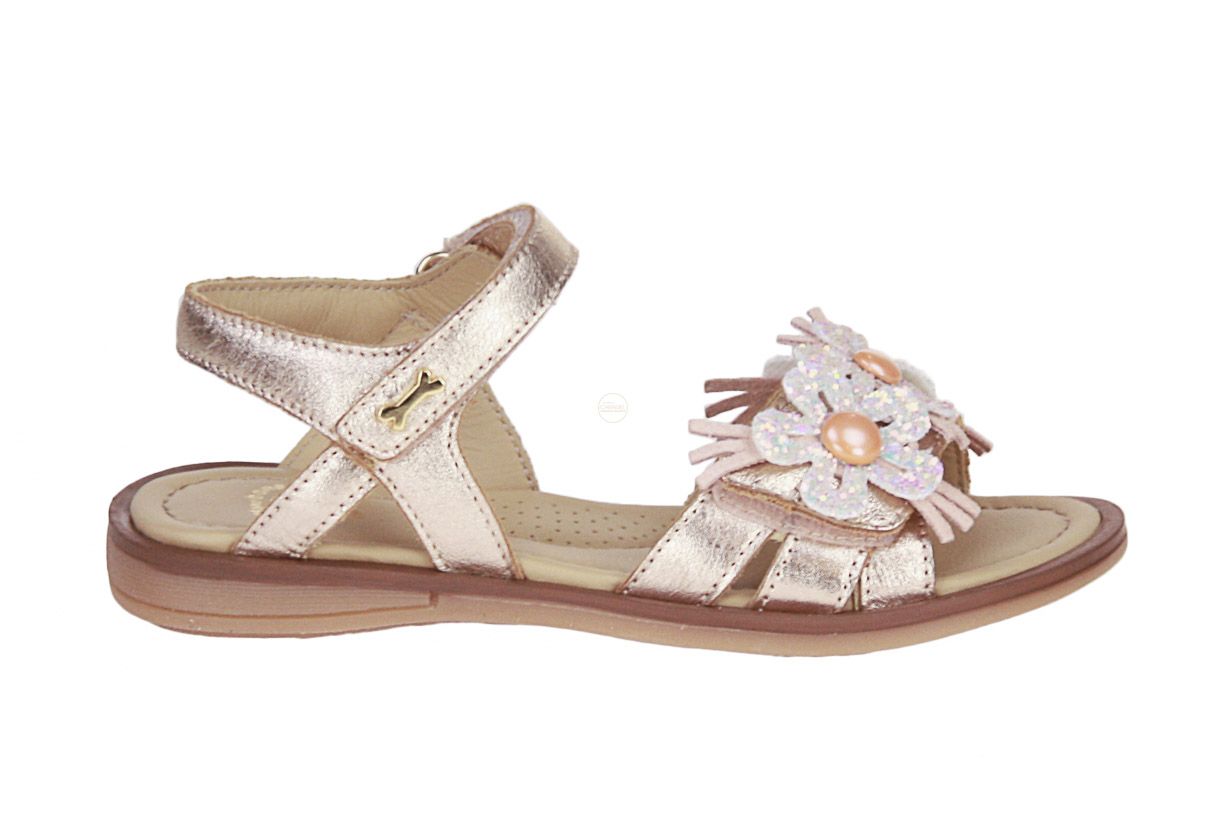 Deze roze metallic lederen meisjessandaal is van het merk Stones and Bones.