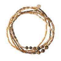 Deze armband van glaskralen, gefacetteerde messing kralen en stukjes tijgeroog kun je 5 keer omwikkelen.